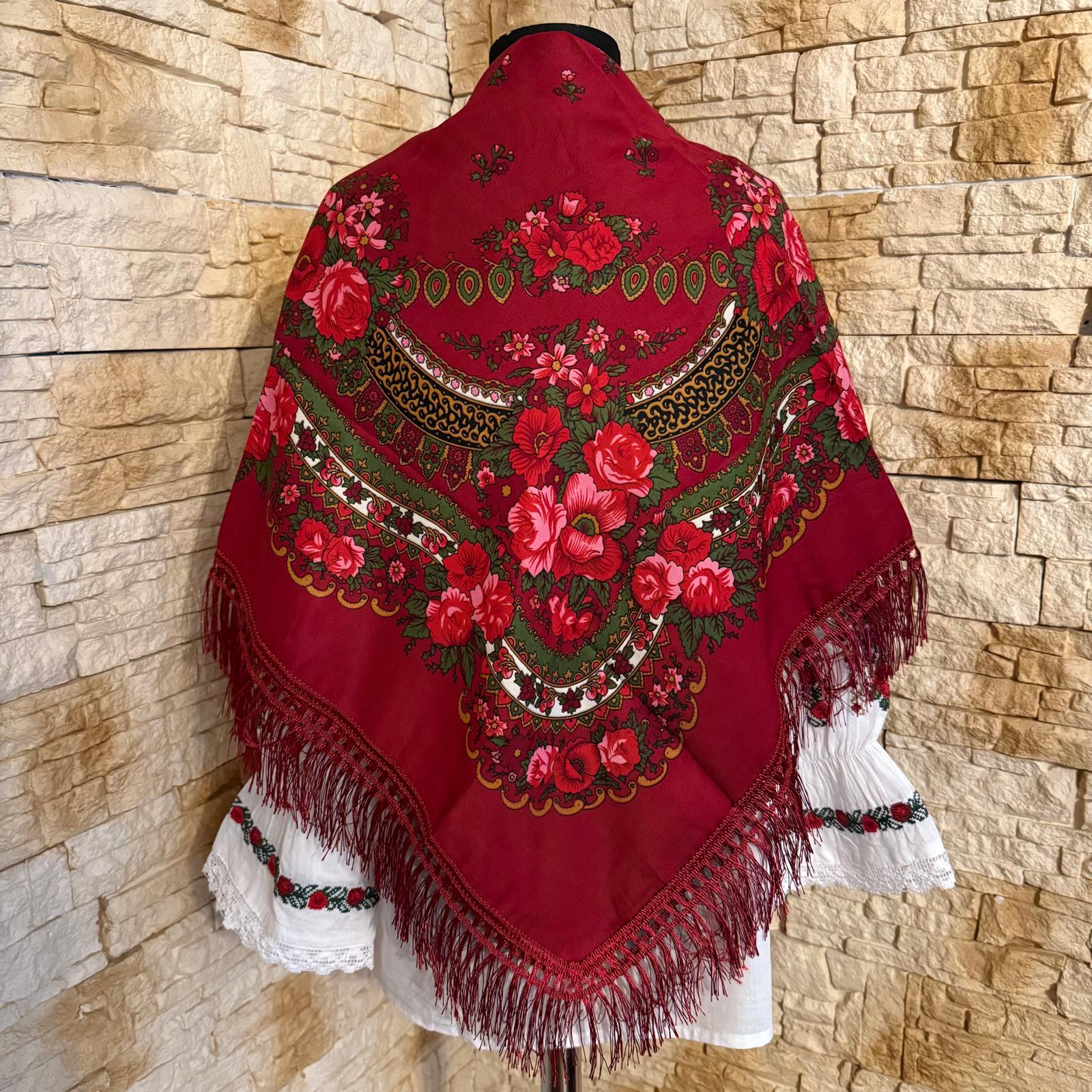 Batic fond rosu cu model floral , accesorizat cu franjuri din matase . Se poarta pe cap sau ca sal, pe umeri, depinde de ocazie . Este un produs ce poate fi purtat atunci cand imbracam un costum traditional sau elegant pe umeri cand purtam o rochie mai simpla. Materialul este ca un bumbac tesut, matasos . Nu aluneca de pe cap , nu ies culorile si nu intra la apa.