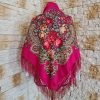 Batic fond siclam cu model floral, accesorizat cu franjuri din matase . Se poarta pe cap sau ca sal, pe umeri, depinde de ocazie. Este un produs ce poate fi purtat atunci cand imbracam un costum traditional sau elegant pe umeri cand purtam o rochie mai simpla. Materialul este ca un bumbac tesut, matasos. Nu aluneca de pe cap , nu ies culorile si nu intra la apa.
