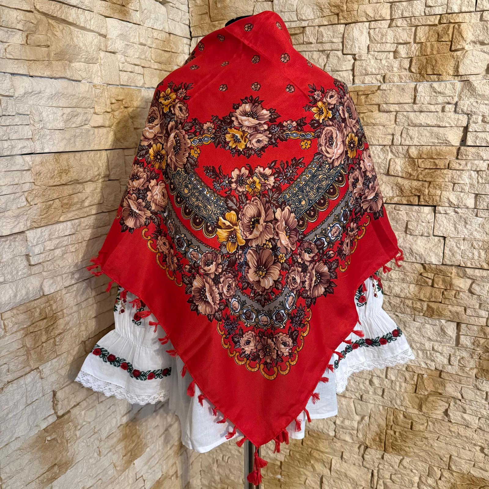 Batic fond rosu cu model floral , accesorizat cu franjuri . Se poarta pe cap sau ca sal, pe umeri, depinde de ocazie . Este un produs ce poate fi purtat atunci cand imbracam un costum traditional sau elegant pe umeri cand purtam o rochie mai simpla. Materialul este foarte bun, casmir . Nu aluneca de pe cap , nu ies culorile si nu intra la apa.