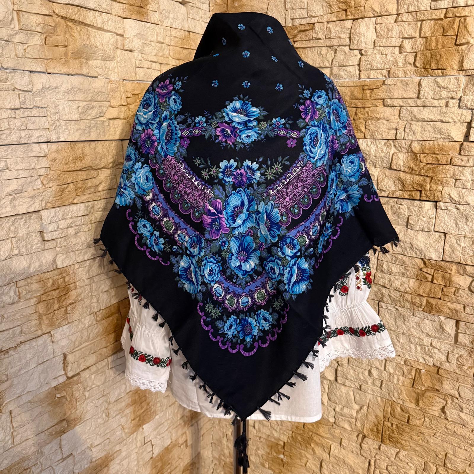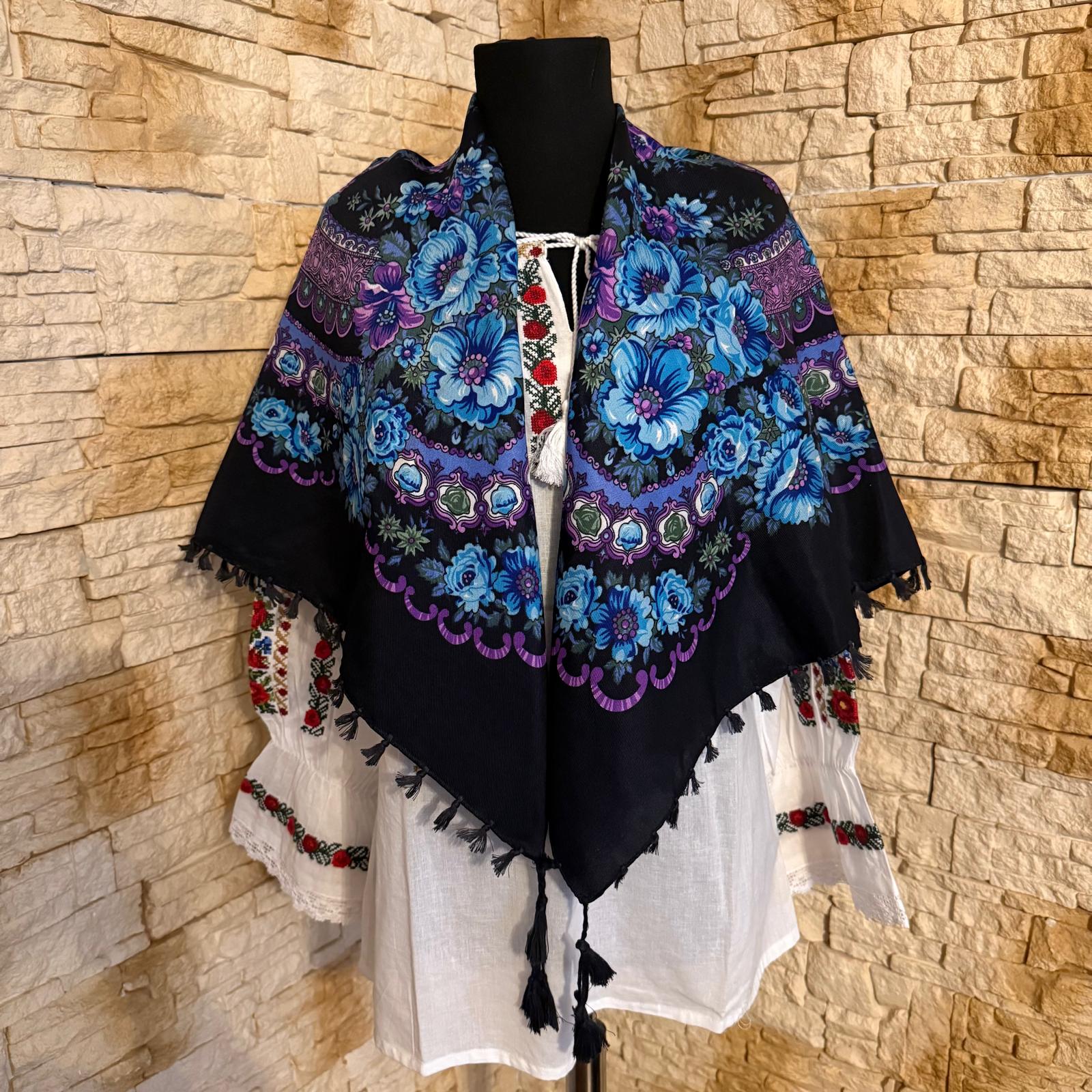 Batic fond bleumarin, model floral , accesorizat cu franjuri . Se poarta pe cap sau ca sal, pe umeri, depinde de ocazie . Este un produs ce poate fi purtat atunci cand imbracam un costum traditional sau elegant pe umeri cand purtam o rochie mai simpla. Materialul este foarte bun, casmir . Nu aluneca de pe cap , nu ies culorile si nu intra la apa.
