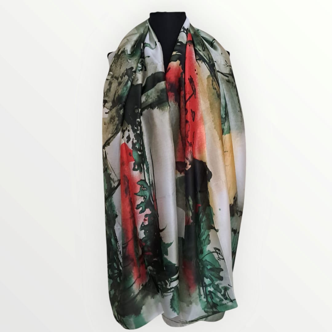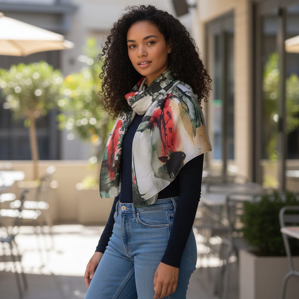- Design distinctiv: Eșarfa prezintă un imprimeu floral artistic și abstract, într-o combinație elegantă de culori.