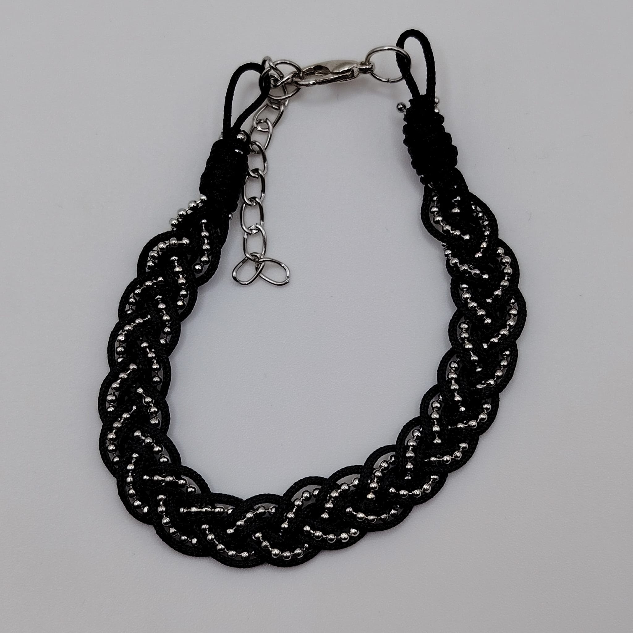 Structură Împletită: Realizată dintr-un șnur negru mătăsos, împletit într-un model lat ce oferă volum și prezență pe încheietură.