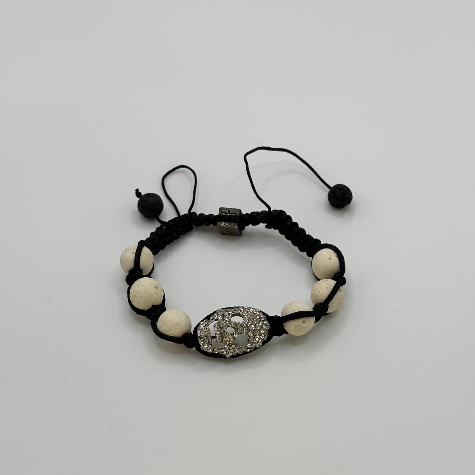 Element Central Statement: Brățara este dominată de un medalion central în formă de craniu argintiu, complet încrustat cu cristale albe strălucitoare, care adaugă o notă luxoasă întregului design.