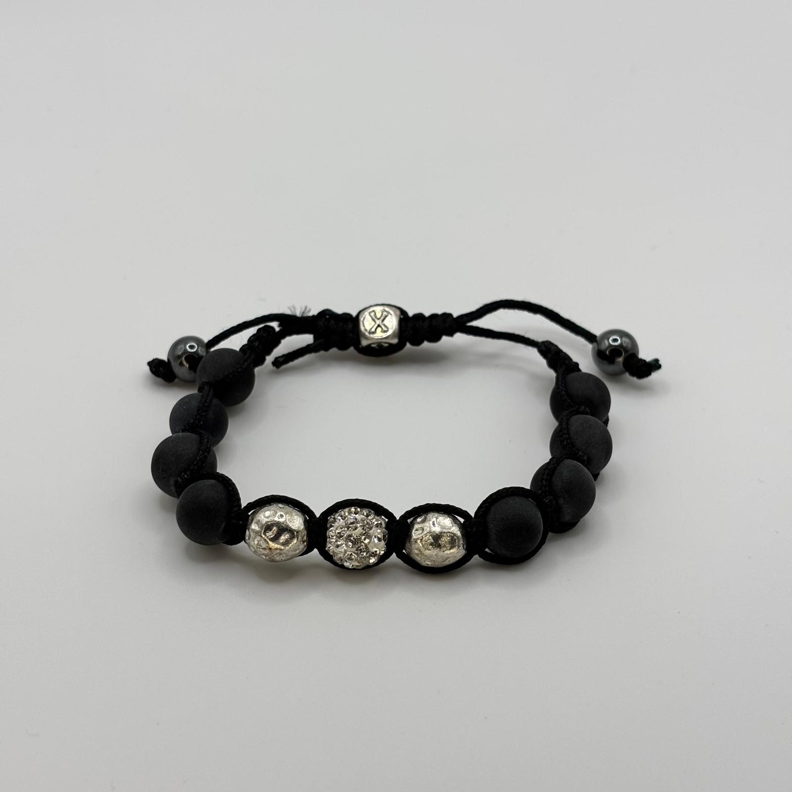 Elemente Centrale Distinctive: Partea frontală prezintă o sferă tip Shamballa încrustată cu micro-cristale albe, flancată de două mărgele argintii cu o textură neregulată, organică, ce amintește de suprafața lunară.