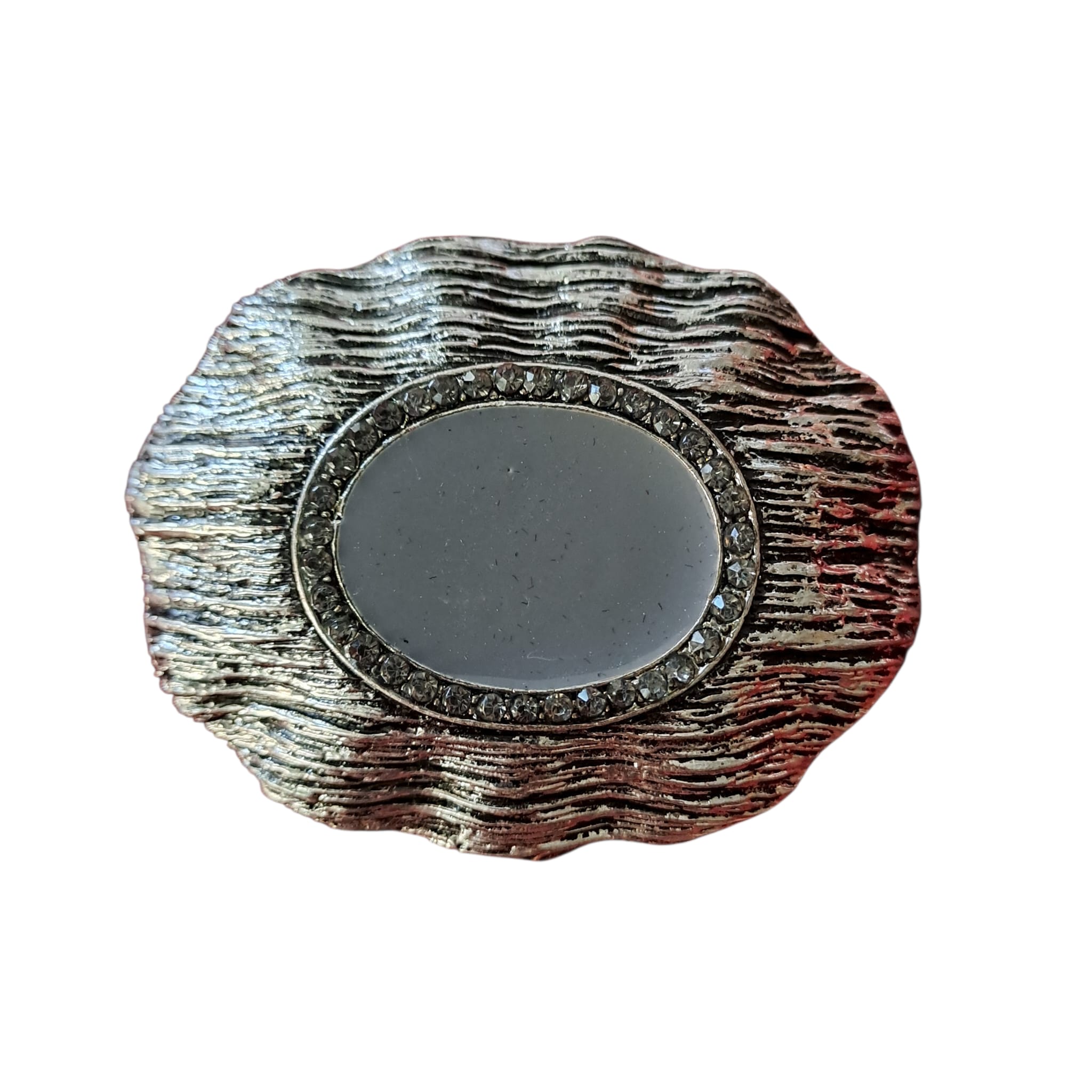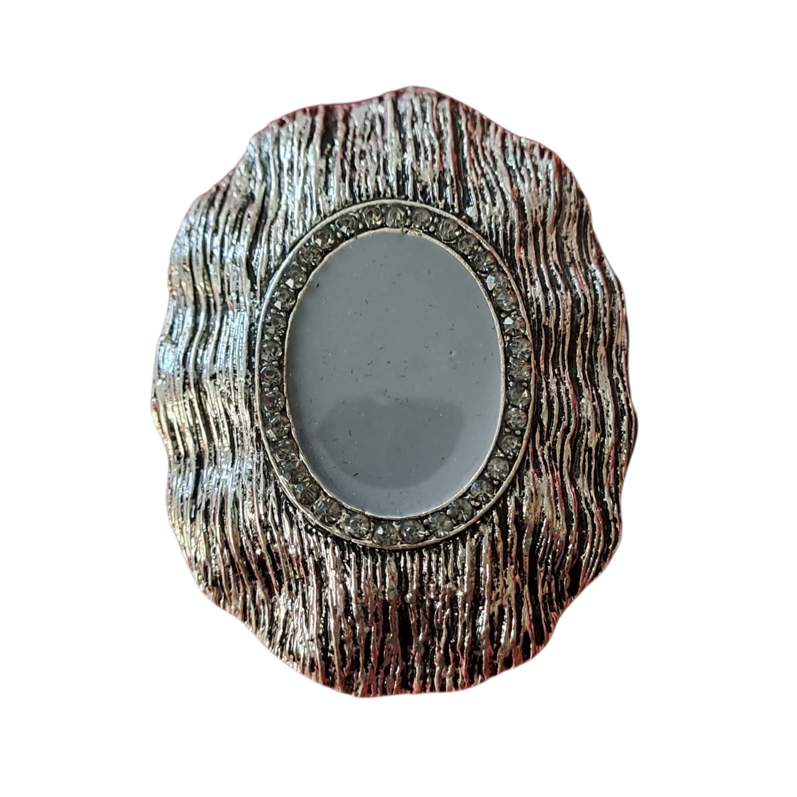 - Partea Centrală: În centru se află un cabochon oval, neted, de un gri intens, care contrastează frumos cu metalul texturat.