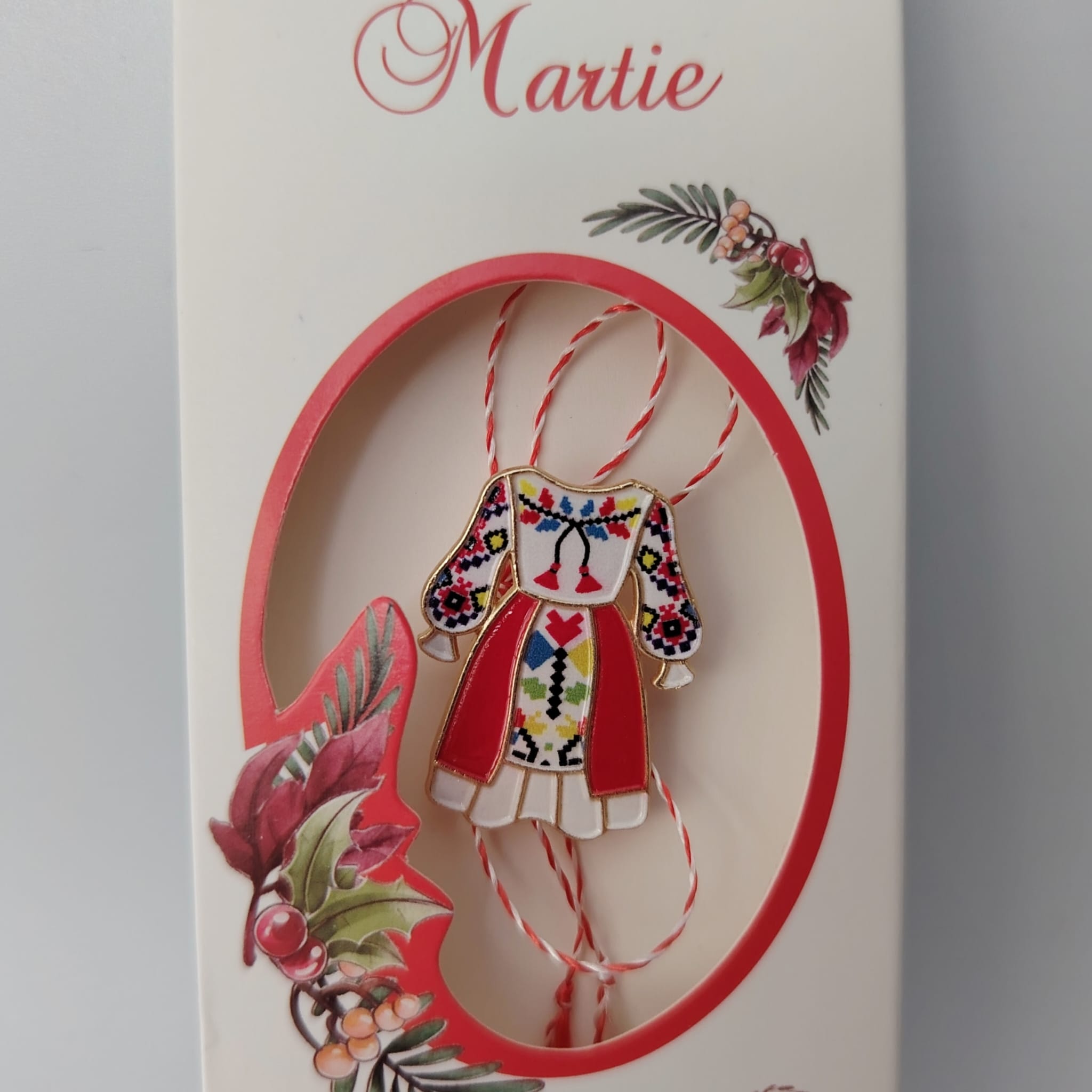 Acest mărțișor tip broșă reprezintă un costum popular feminin tradițional, fiind un simbol autentic al primăverii în România. Broșa este realizată cu detalii colorate ce imită motivele populare de pe ie și fotă, fiind atașată de clasicul șnur alb-roșu.