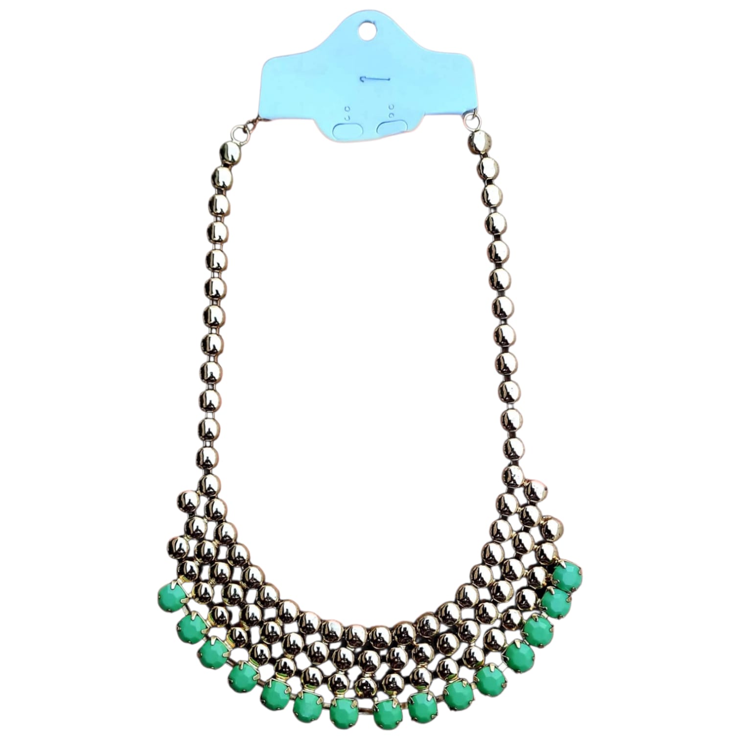 - Design: Colierul este un model tip choker, așezându-se la baza gâtului. Prezintă trei rânduri de mărgele rotunde din metal, lucioase, de culoare aurie, și este decorat cu strasuri din plastic verzi la bază.