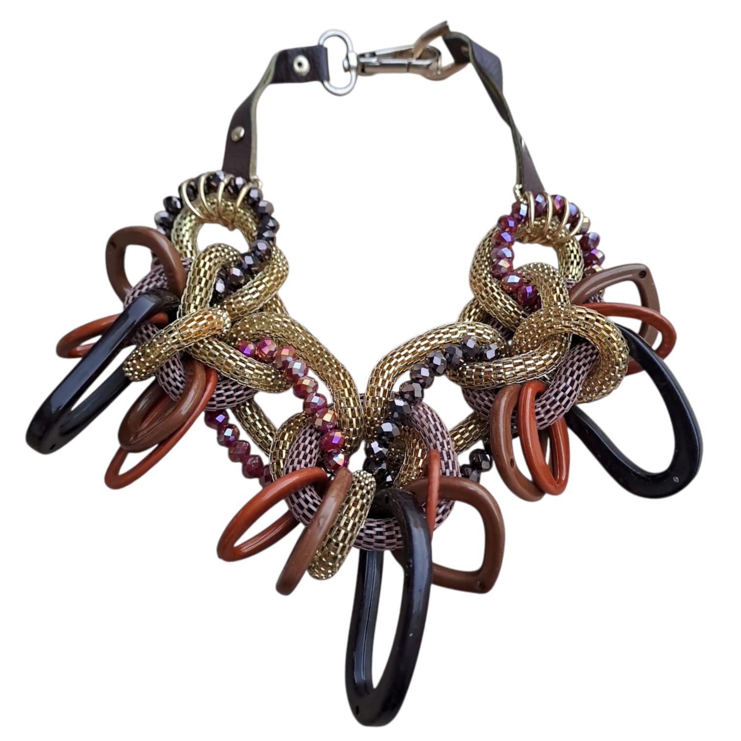 Colierul statement este un accesoriu complexmasiv și multicolor, perfect pentru a adăuga o notă unică și avangardistă oricărei ținute. Designul său combină o bază din piele naturală maro închis cu elemente metalice aurii și inele din material sintetic/lemn în diverse nuanțe.