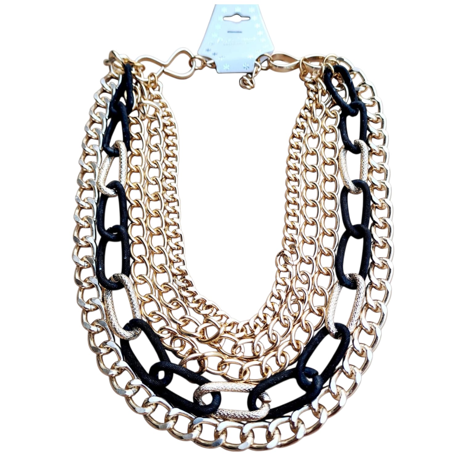 • Textură Bogată: Amestecul de texturi – metal lucios, zale negre netede și lanțuri subțiri – creează o piesă de bijuterie complexă și interesantă.