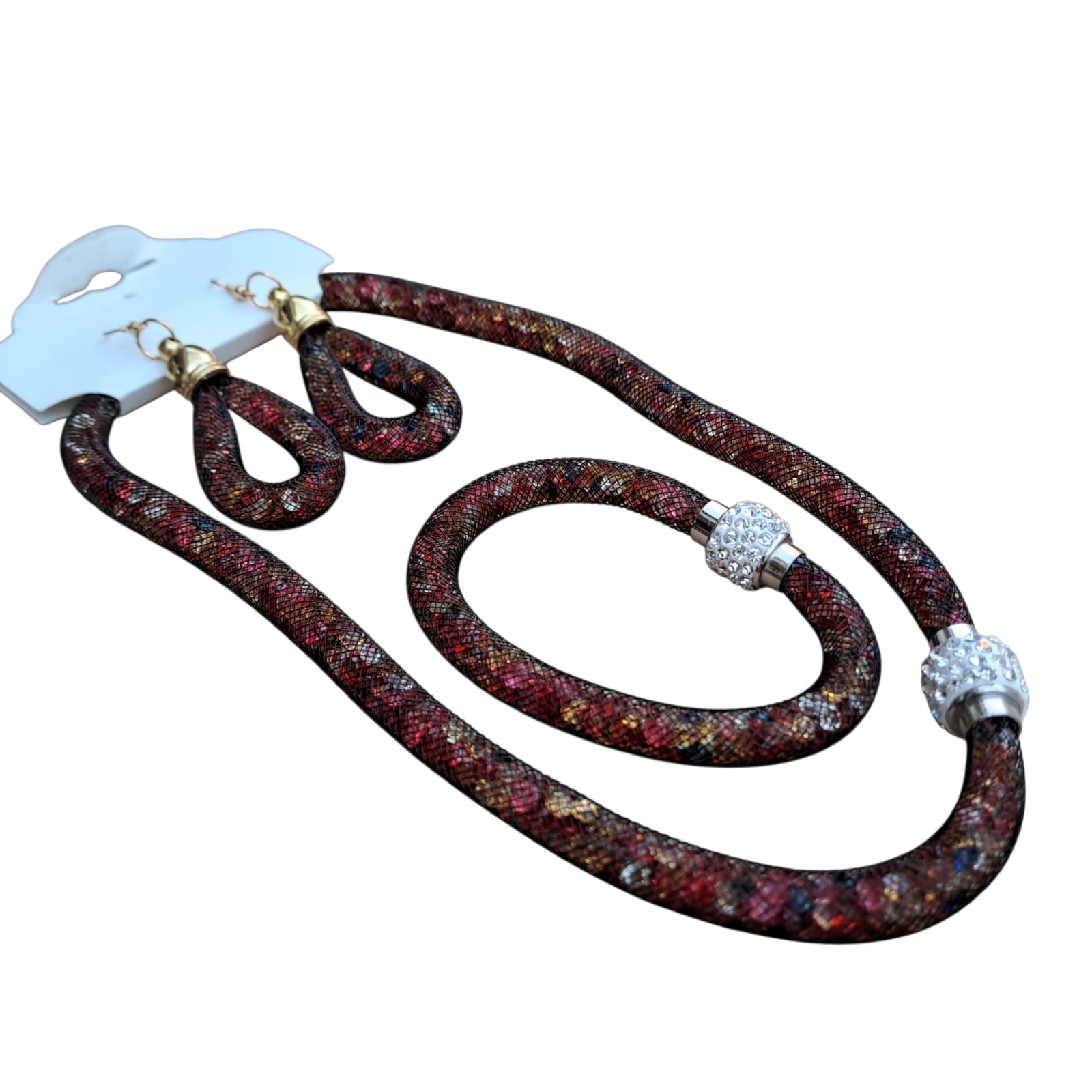- Design: Set asortat format din colier, brățară și cercei, caracterizat prin tubulatura plină cu cristale.