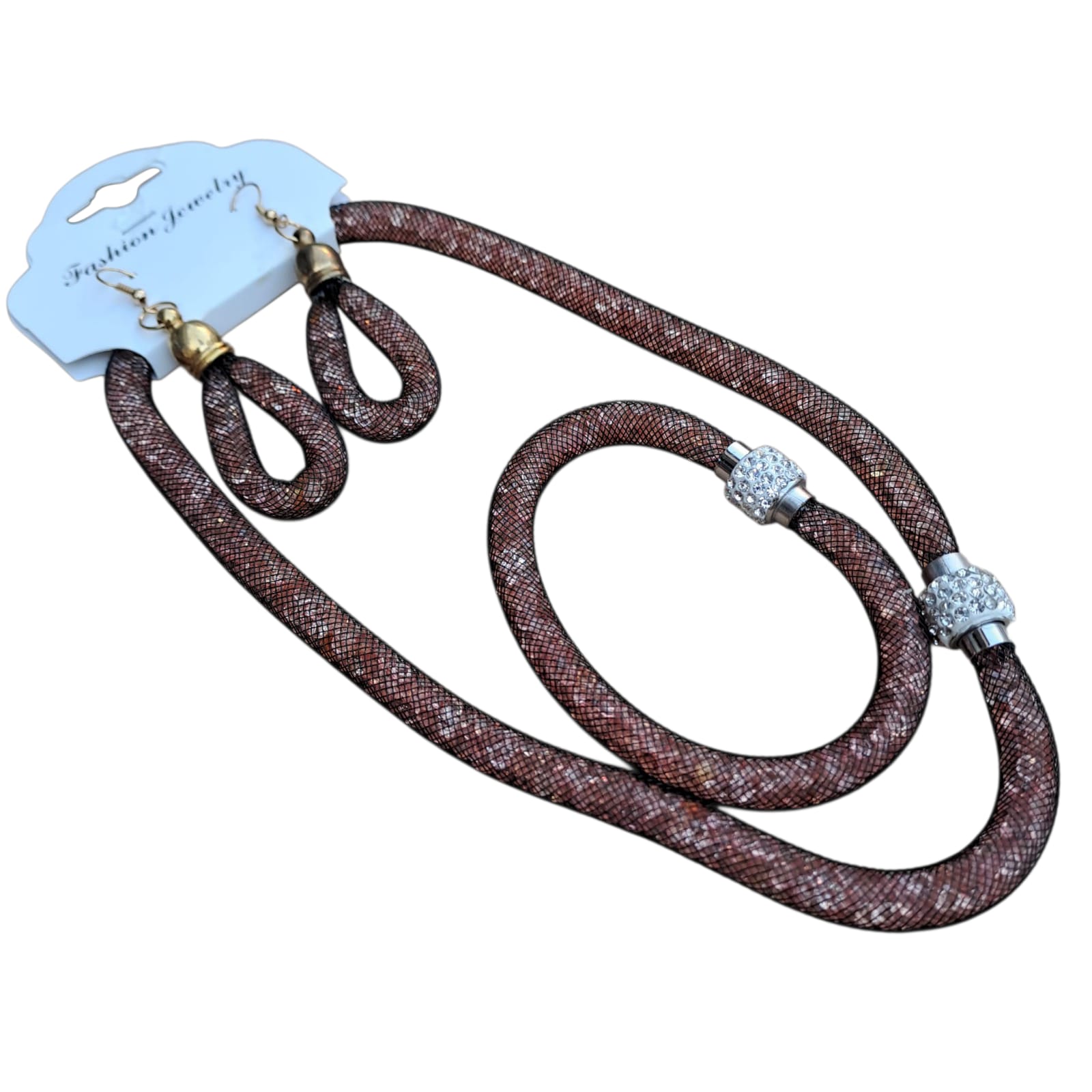 • Material: Plasă flexibilă (nailon) umplută cu mărgele/cristale de nisip, cu închideri magnetice pentru colier și brățară, și cârlige aurii pentru cercei.