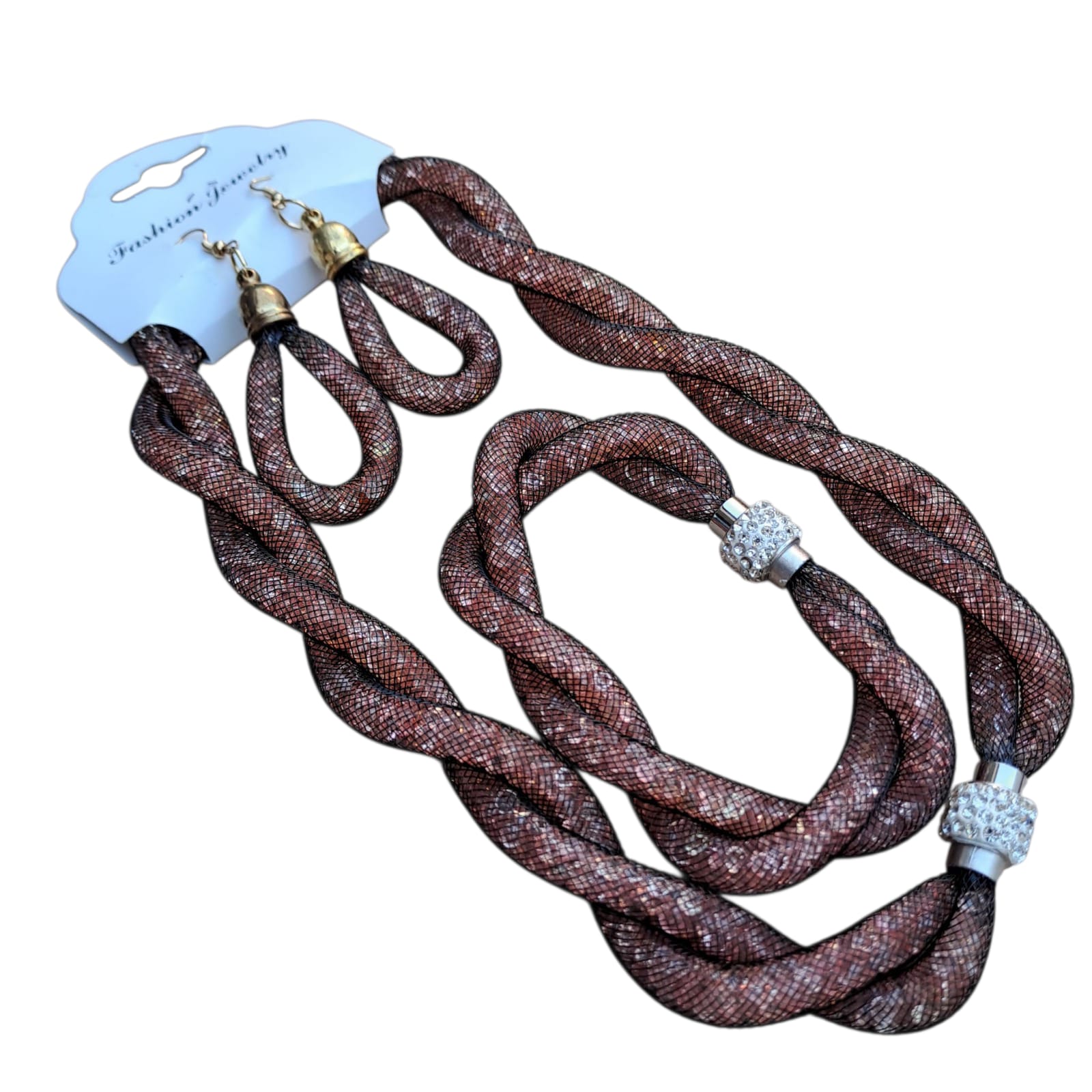 - Material: Plasă flexibilă (nailon) umplută cu mărgele/cristale de sticlă, cu închideri magnetice pentru colier și brățară, și cârlige aurii pentru cercei.
