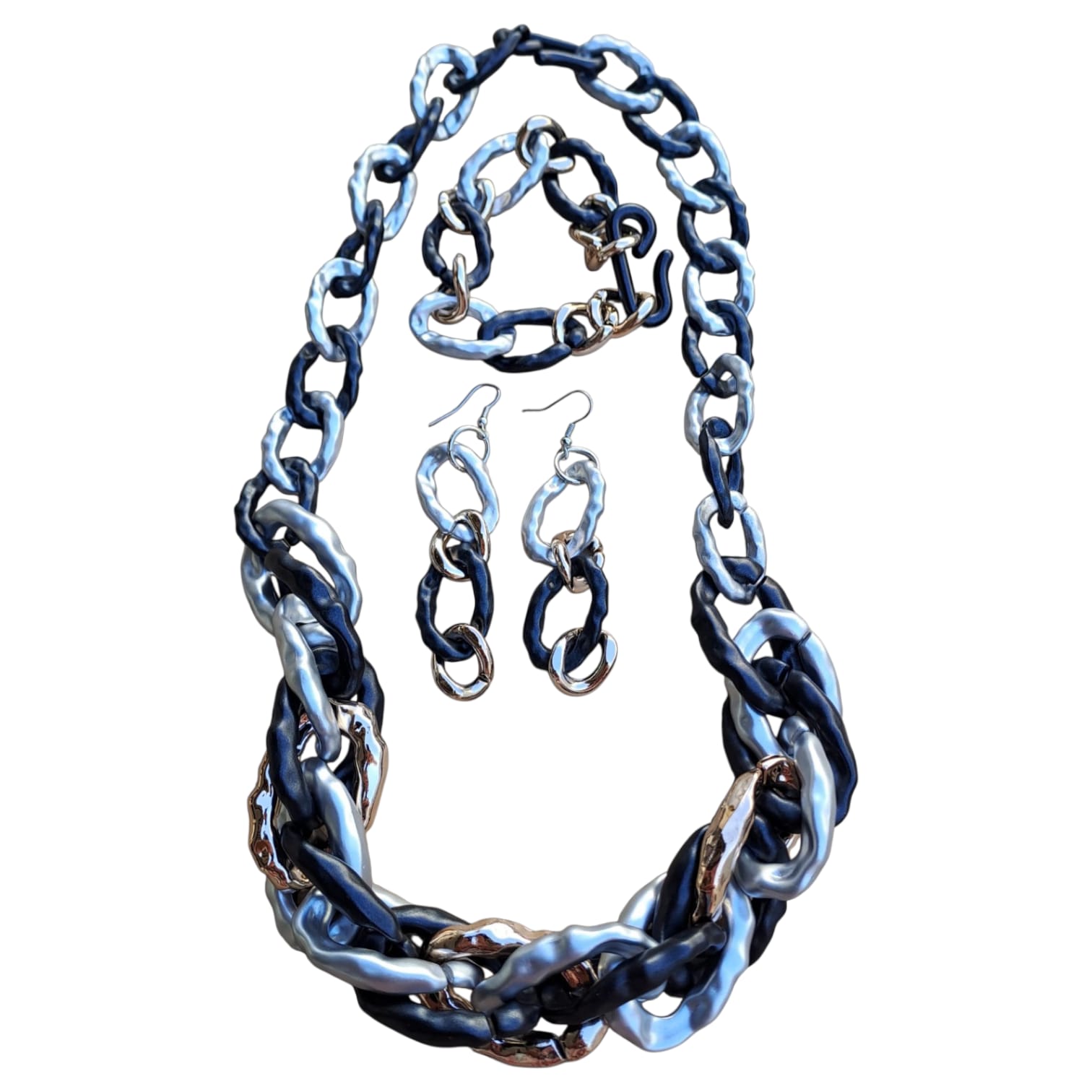 Set colier, cercei si bratara din plastic impletit, negru-aramiu-argintiu – design fluid