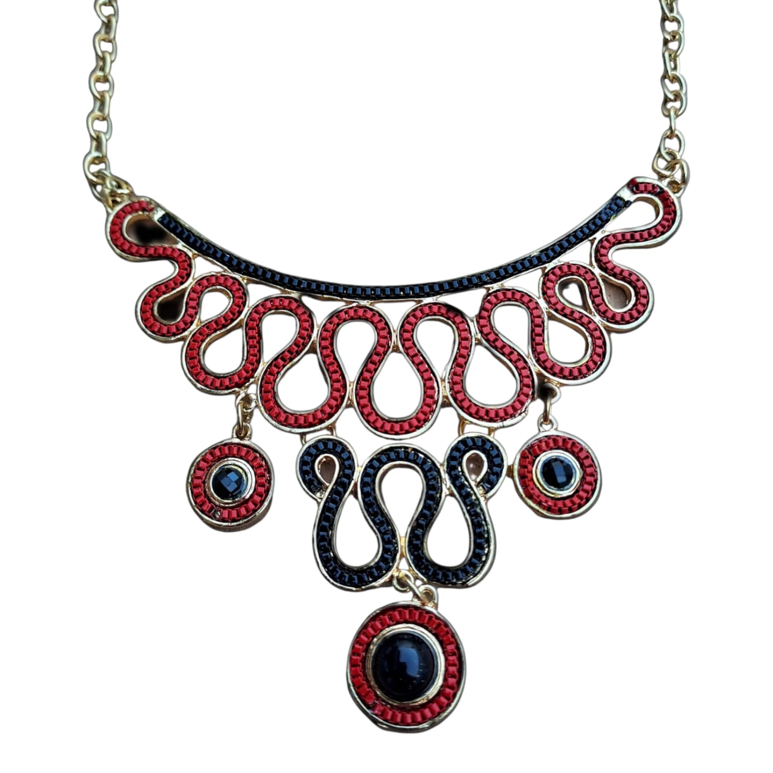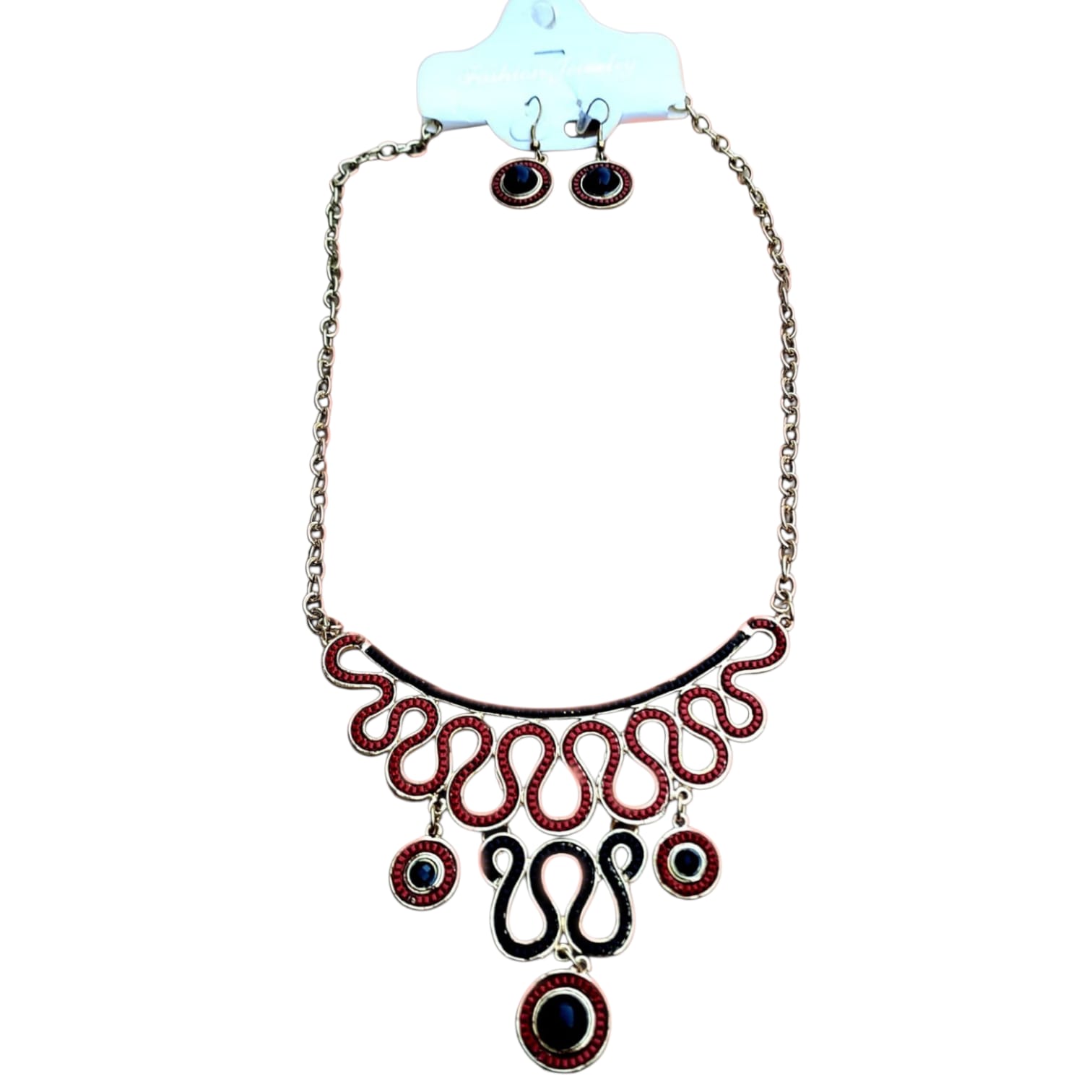 Acest set statement impresionează prin designul său spectaculos, realizat din margelute negre si rosii, dispuse într-o formă serpuita și aerisită. Jocul delicat de linii creează un efect vizual rafinat, ideal pentru apariții elegante.