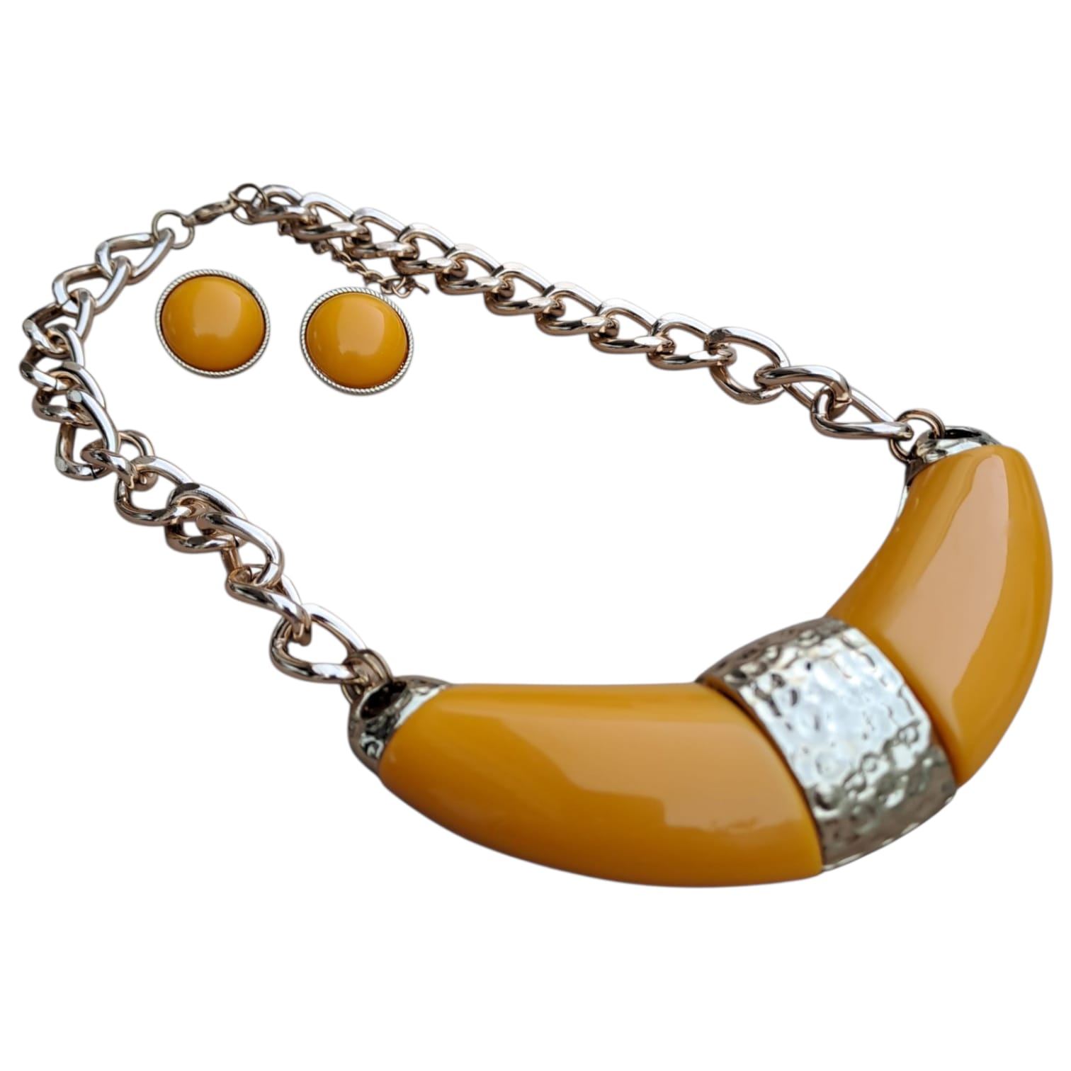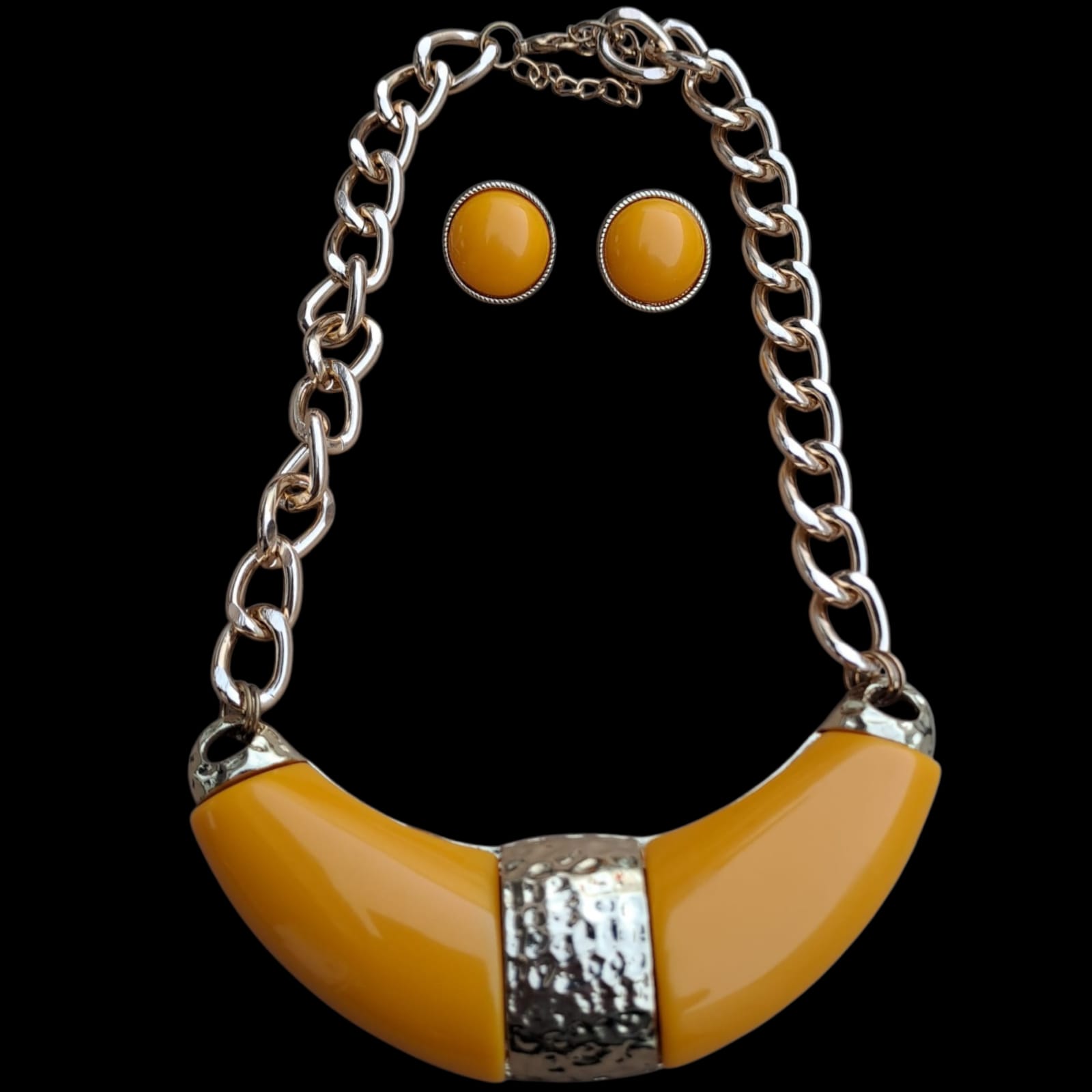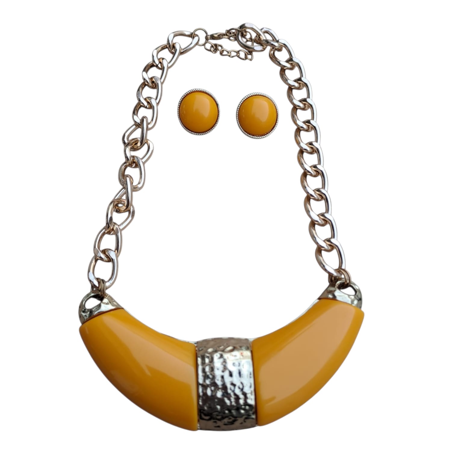 Acest set statement atrage privirile prin combinația îndrăzneață de galben muștar și detalii metalice argintii. Colierul este compus din elemente curbate cu finisaj lucios, puse în valoare de un lanț cu zale mari, ce adaugă un aer modern și puternic designului. Elementul central metalic, cu textură ciocănită, oferă un contrast interesant și un plus de rafinament.