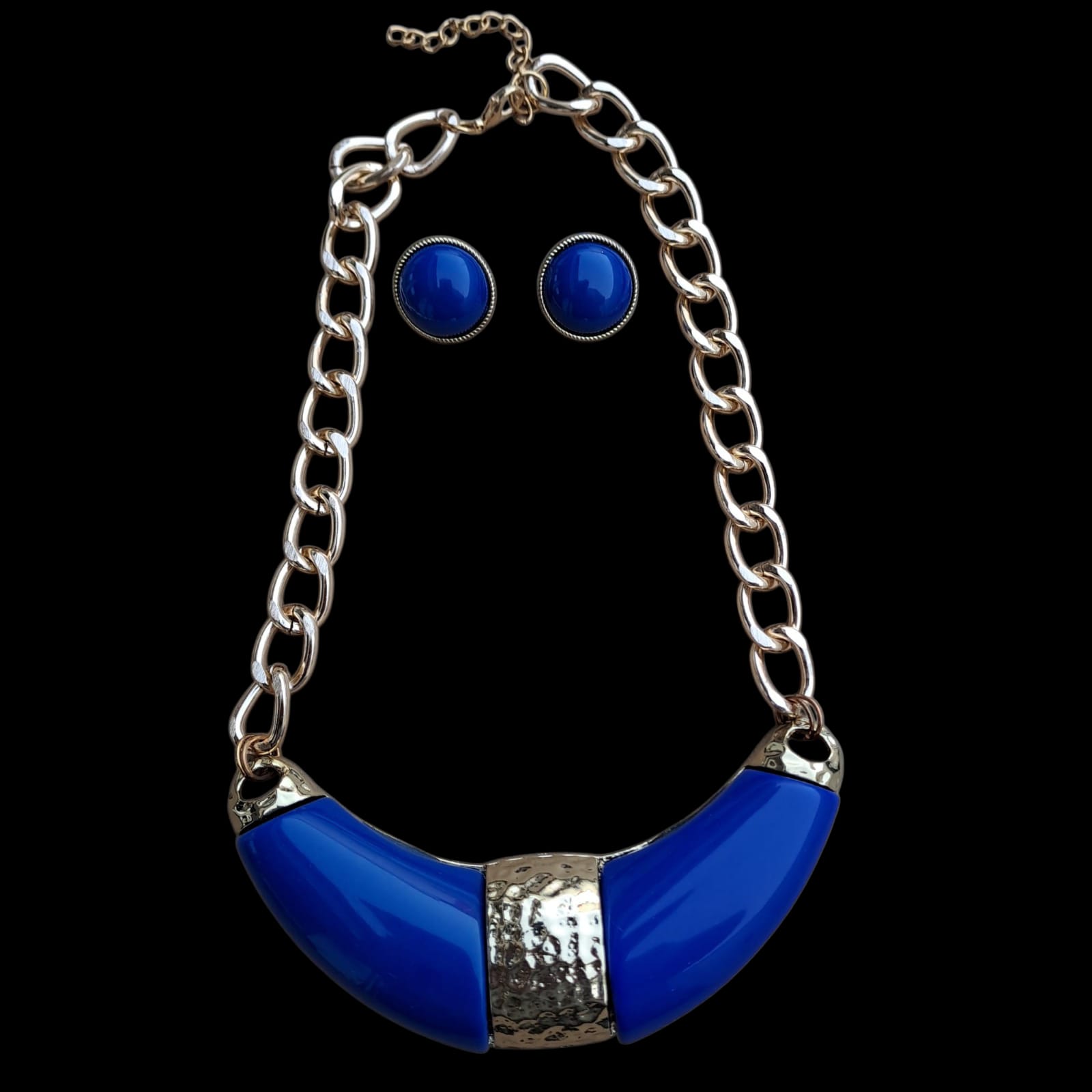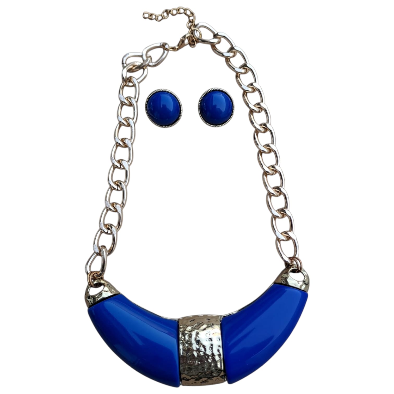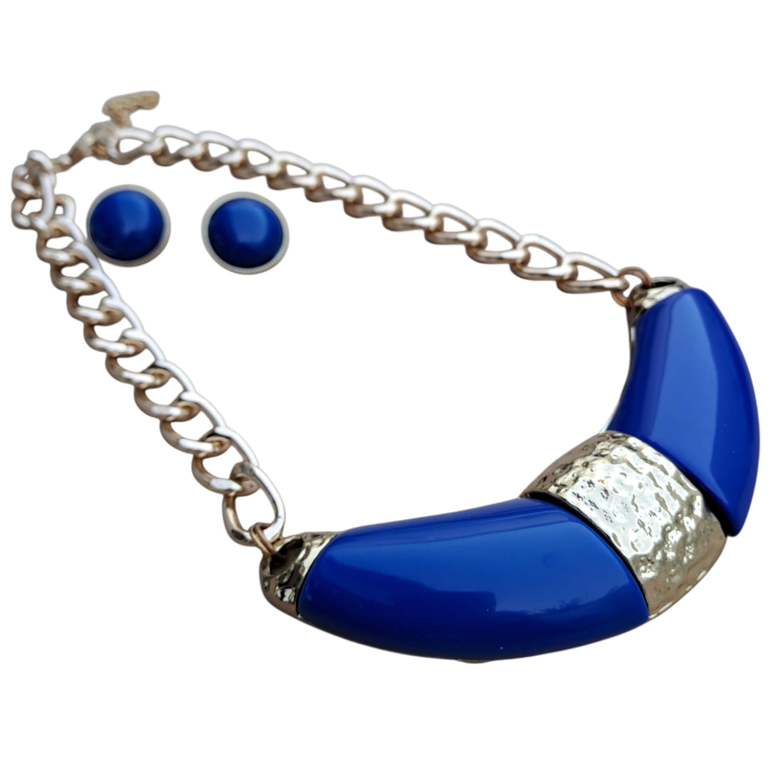 Acest set statement atrage privirile prin combinația îndrăzneață de galben muștar și detalii metalice argintii. Colierul este compus din elemente curbate cu finisaj lucios, puse în valoare de un lanț cu zale mari, ce adaugă un aer modern și puternic designului. Elementul central metalic, cu textură ciocănită, oferă un contrast interesant și un plus de rafinament.