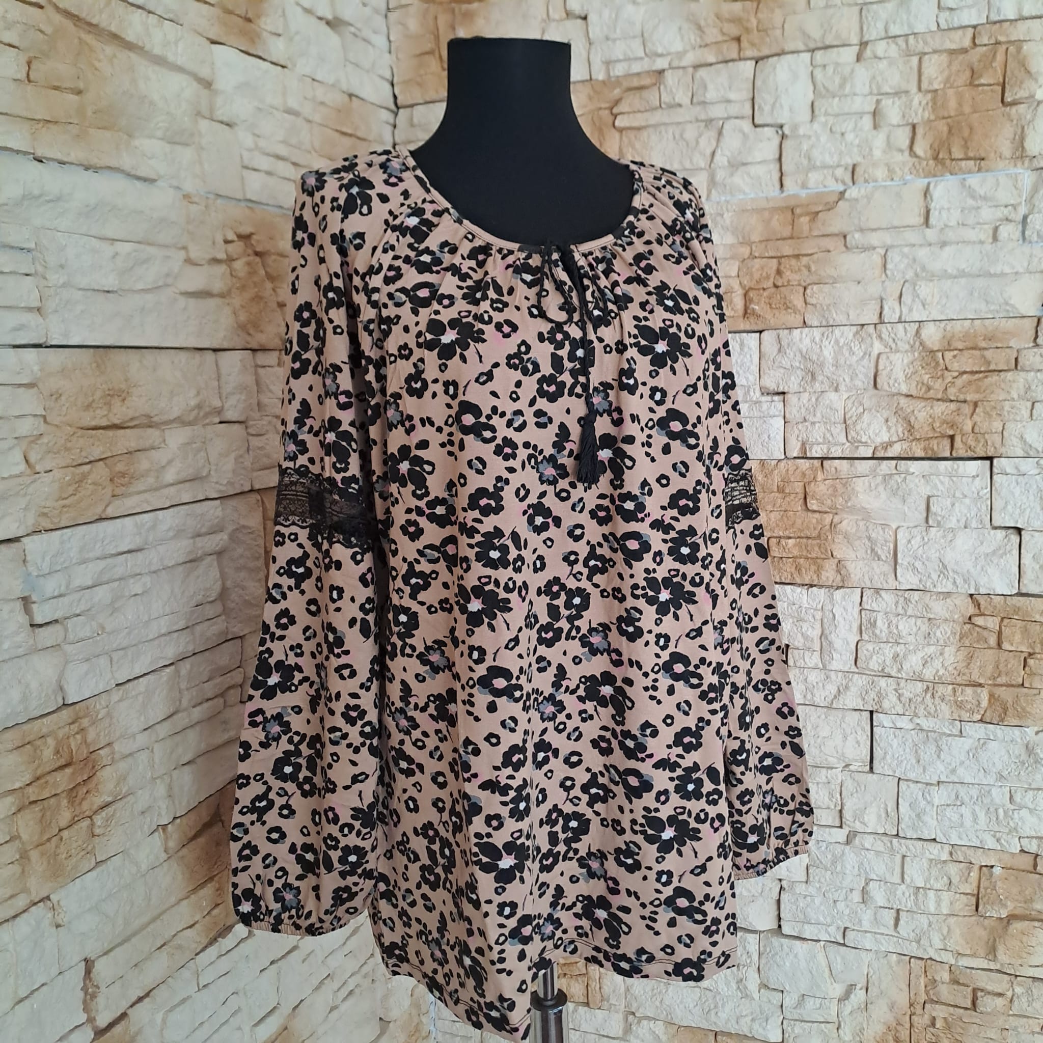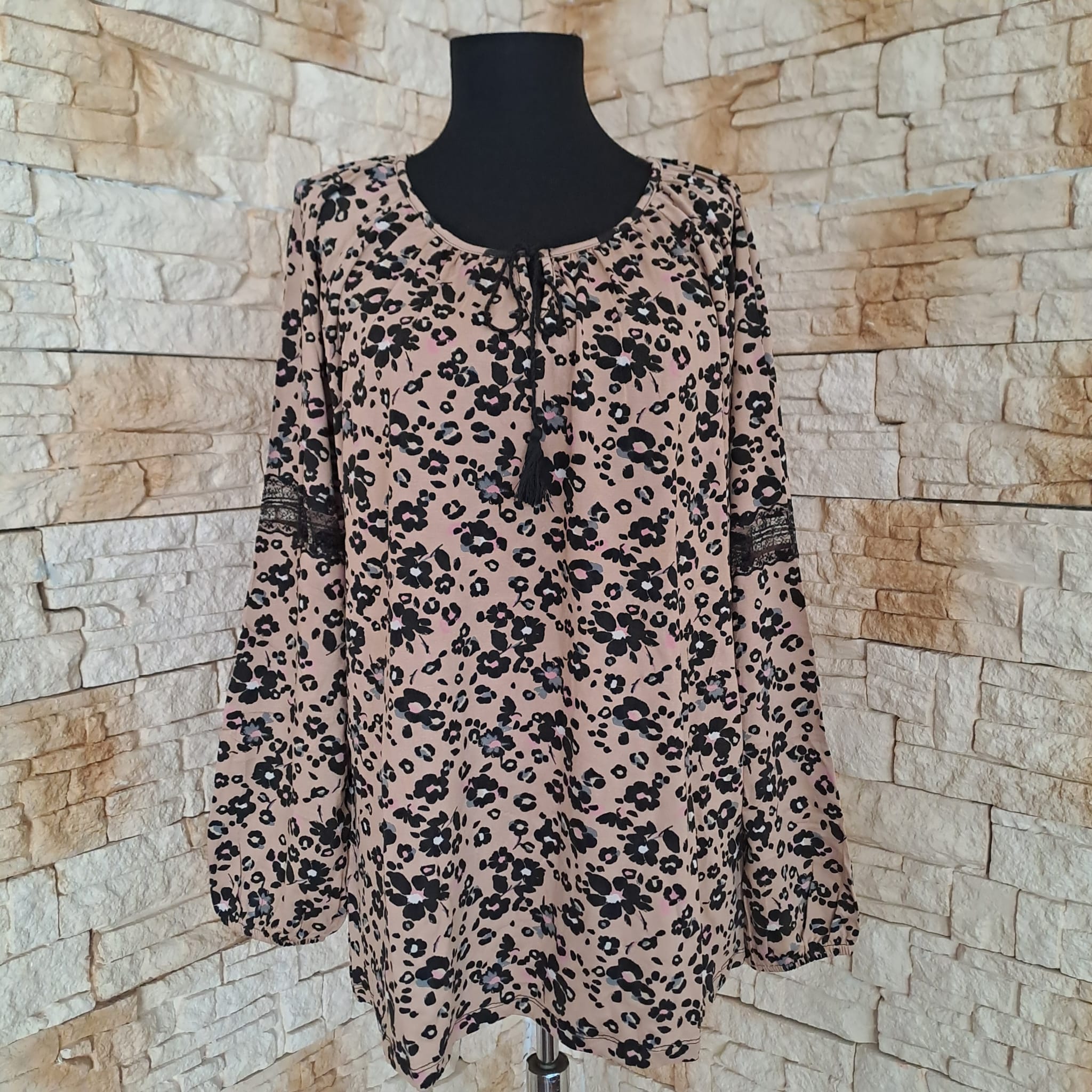 Bluza fond bej cu  motive florale mici negre, cu maneca lunga din vascoza , perfecta pentru sezonul de toamna/iarna.