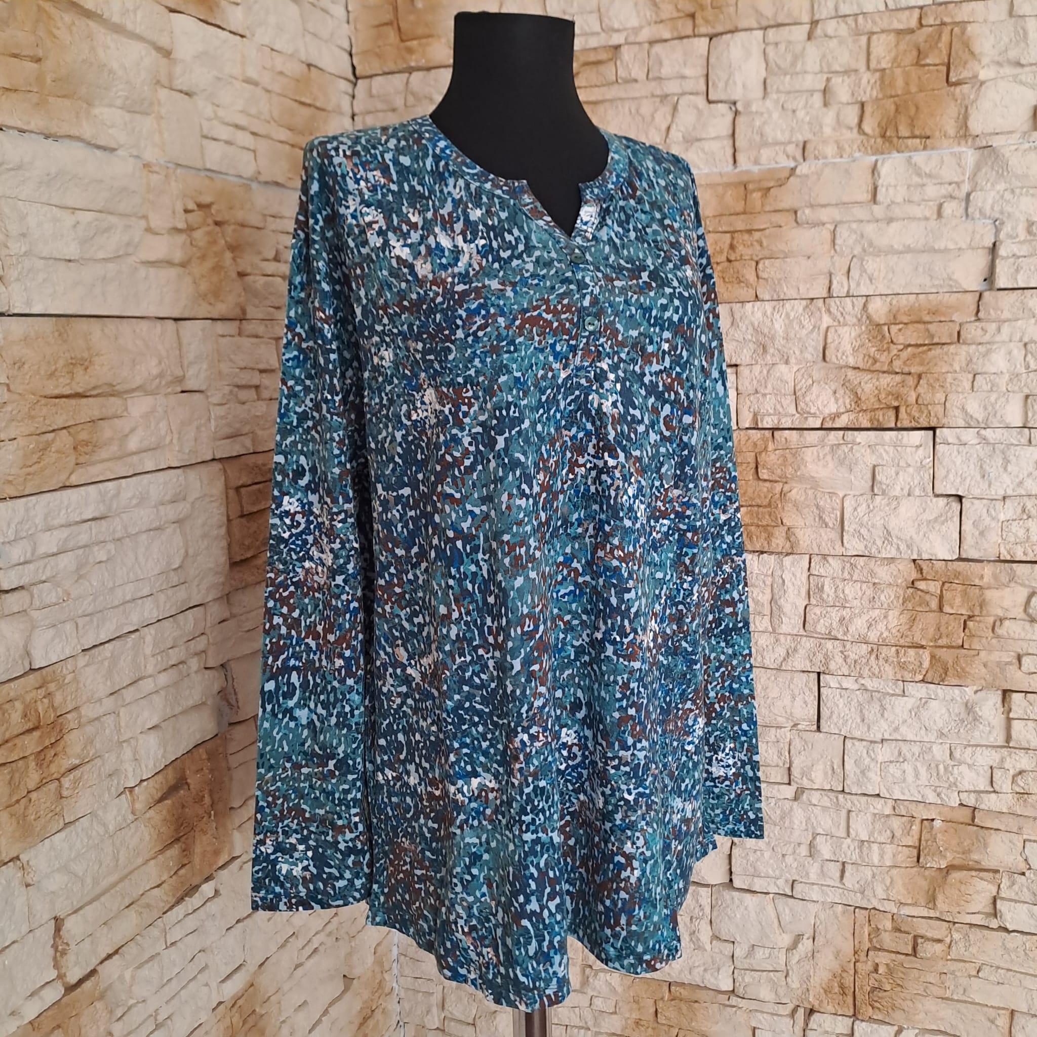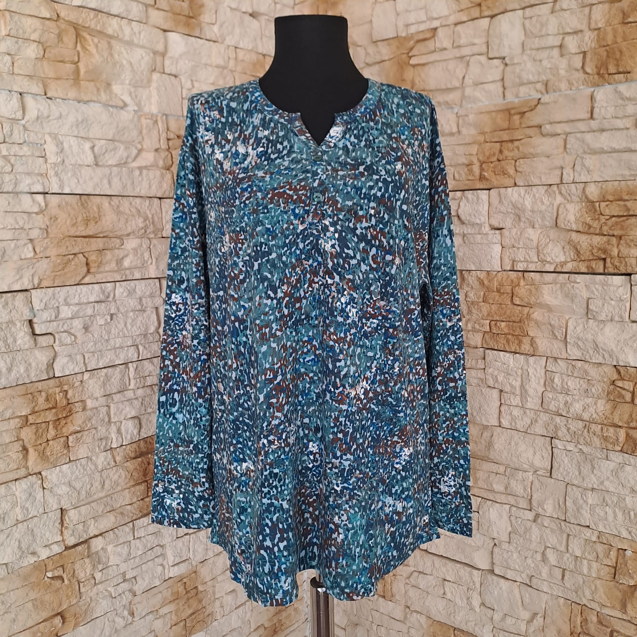 Bluza fond verde/turcoaz cu motive florale mici, cu maneca lunga din vascoza , perfecta pentru sezonul de toamna/iarna.
