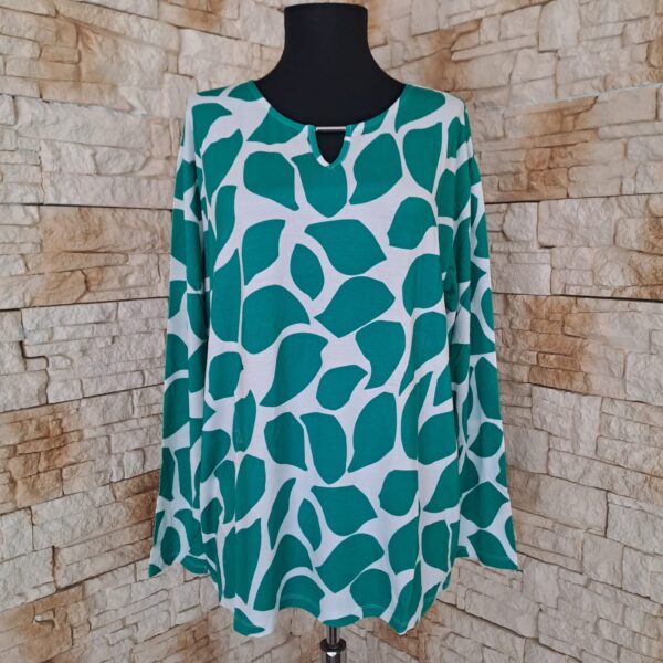 Bluza fond crem cu motive geometrice turcoaz, cu maneca lunga din vascoza , perfecta pentru sezonul de toamna/iarna.
