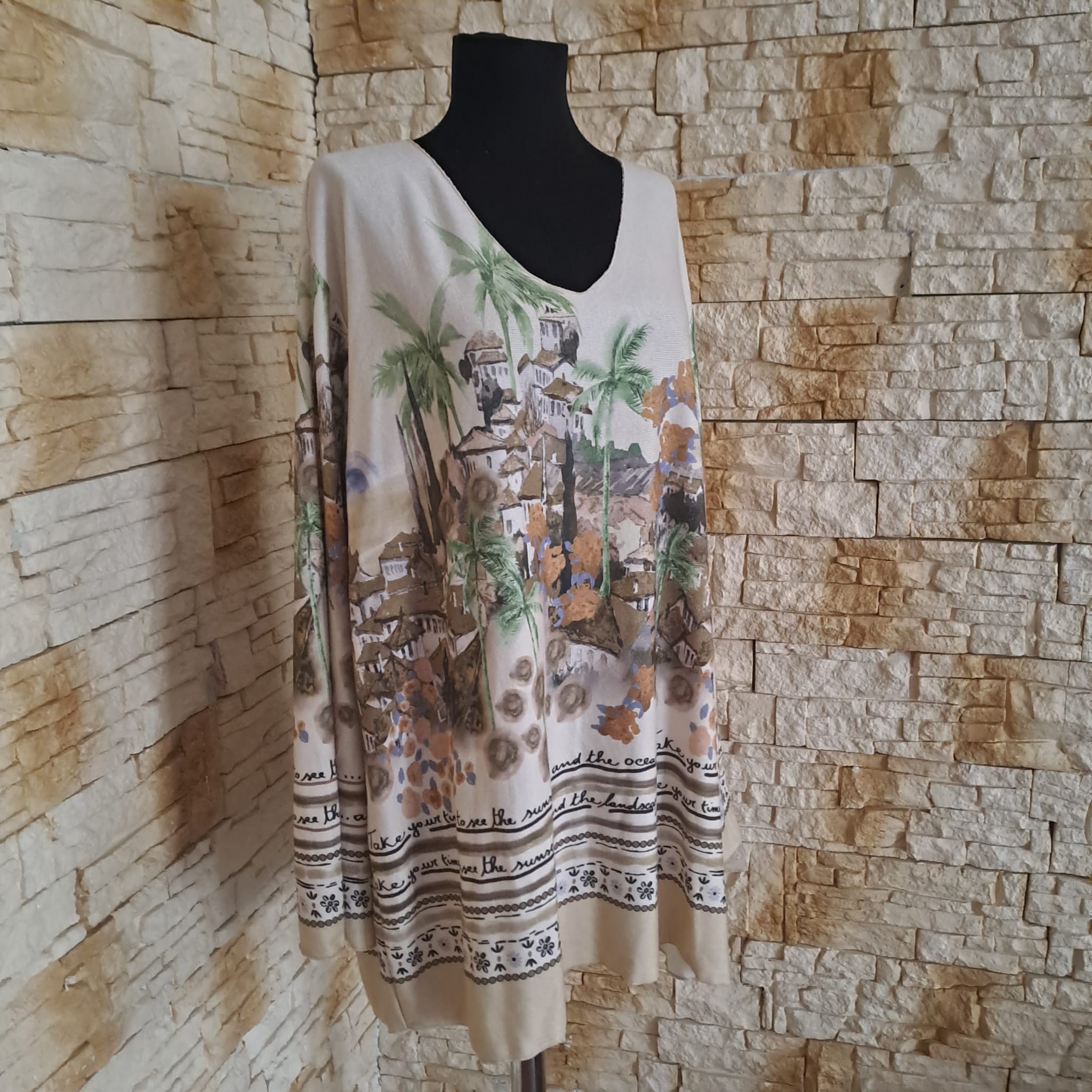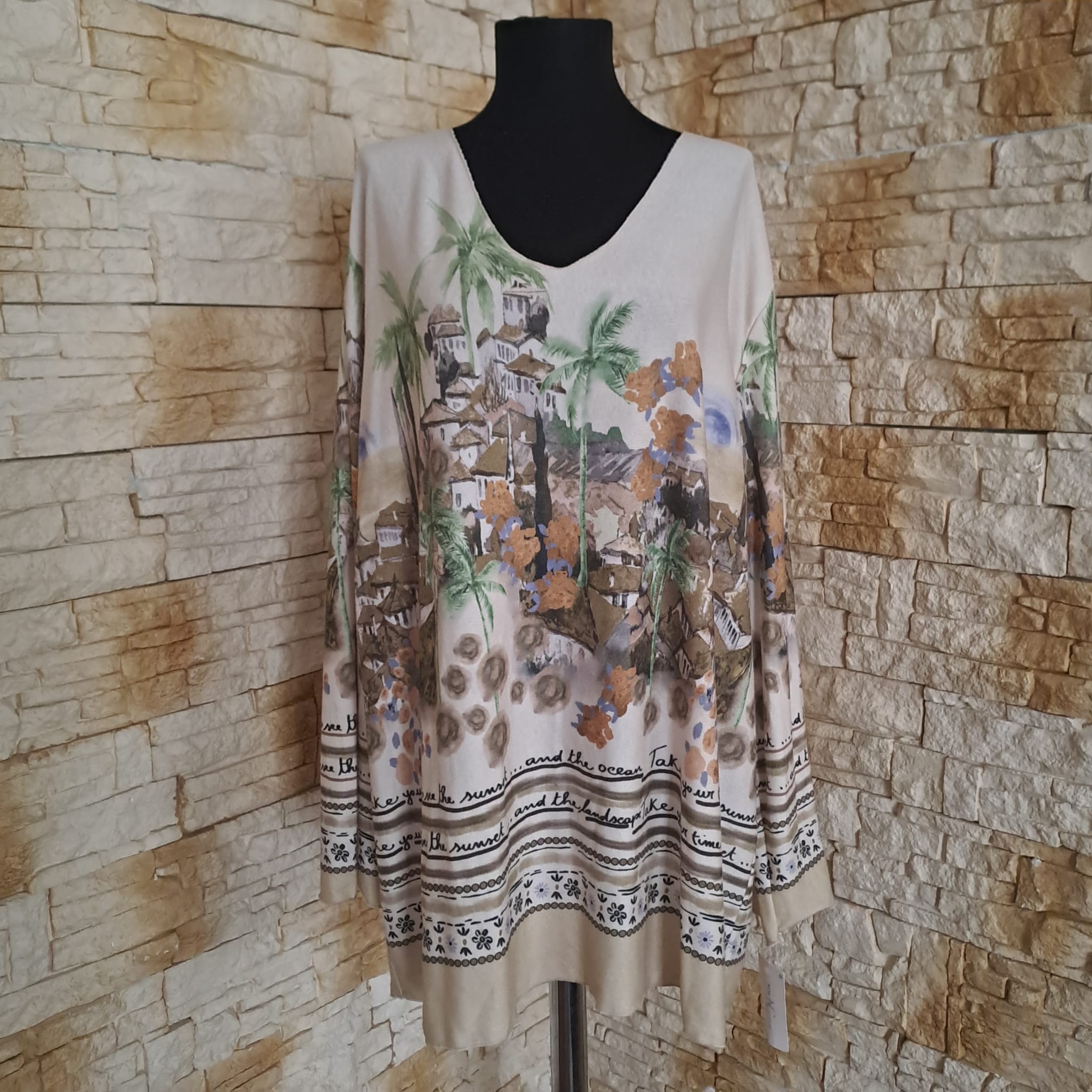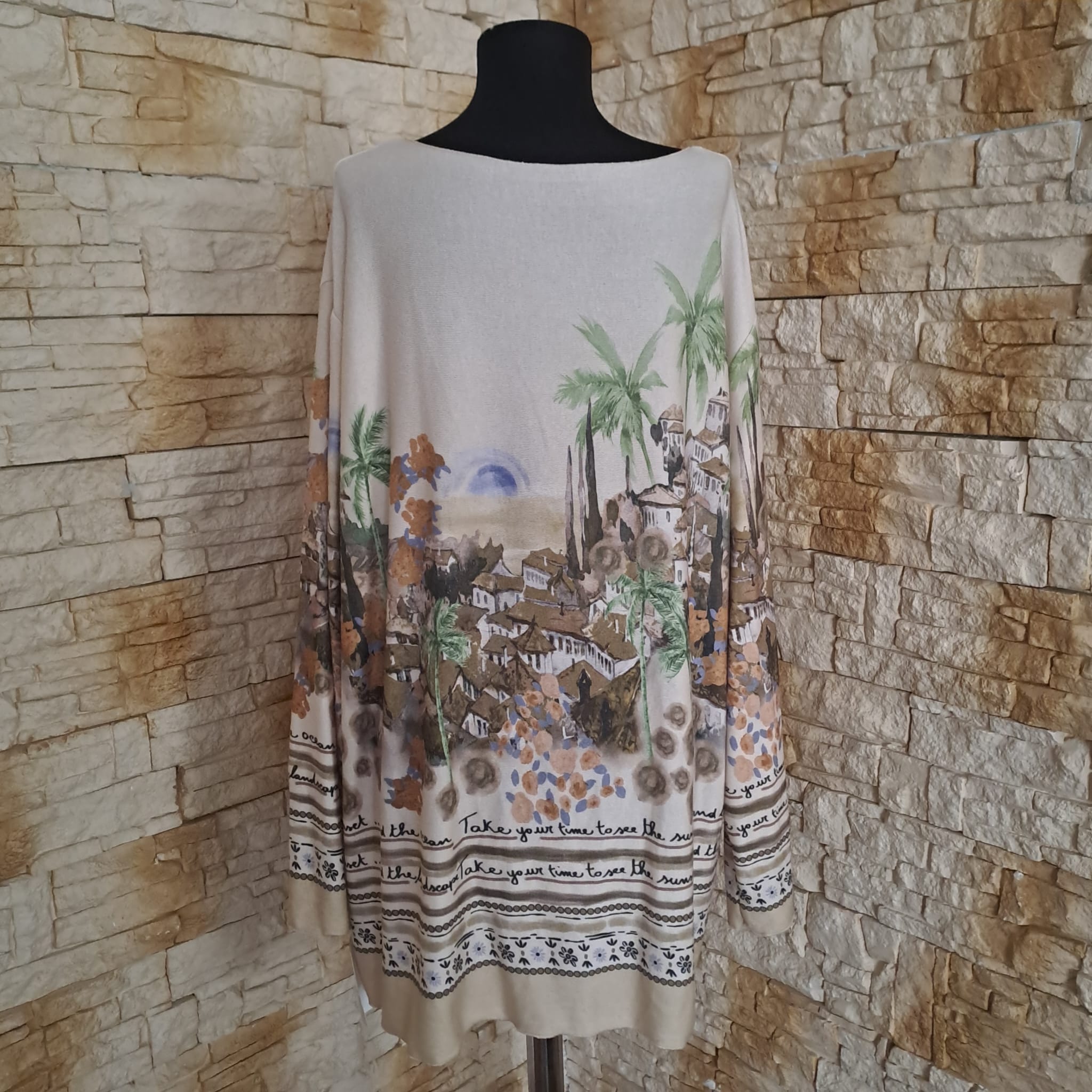 Adaugă o notă artistică garderobei tale cu aceasta bluza cu croi lejer, ideal pentru siluetele generoase. Designul său captivant, cu un peisaj mediteranean și mesaje inspiraționale precum „Take me to the sunset”, transformă o piesă casual într-o declarație de stil boem și relaxat.