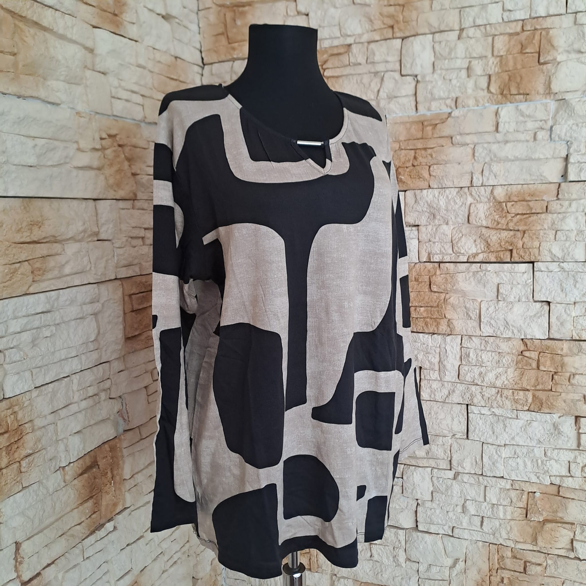 Bluza  fond crem cu  motive geometrice negre, cu maneca lunga din vascoza , perfecta pentru sezonul de toamna/iarna.