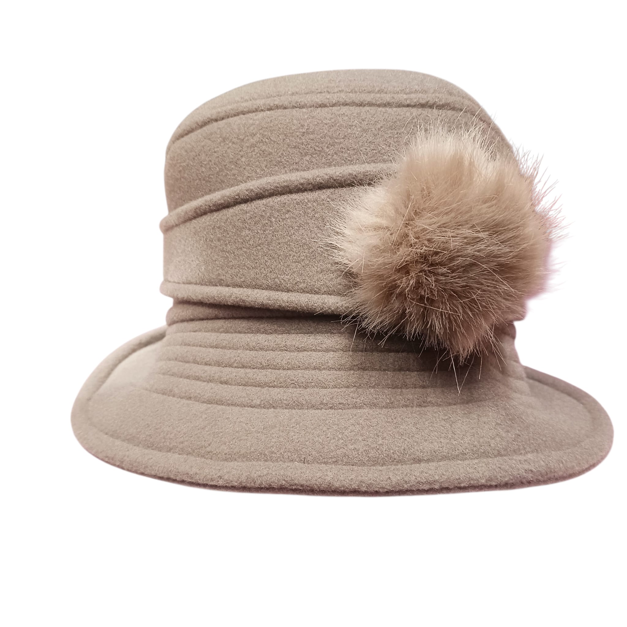 Pălărie elegantă de damă, tip cloche, realizată din material textil tip fetru sintetic, plăcut la atingere și rezistent. Model clasic, de culoare bej, accesorizat cu bandă decorativă și aplicație din blana pe lateral, care oferă un plus de rafinament.