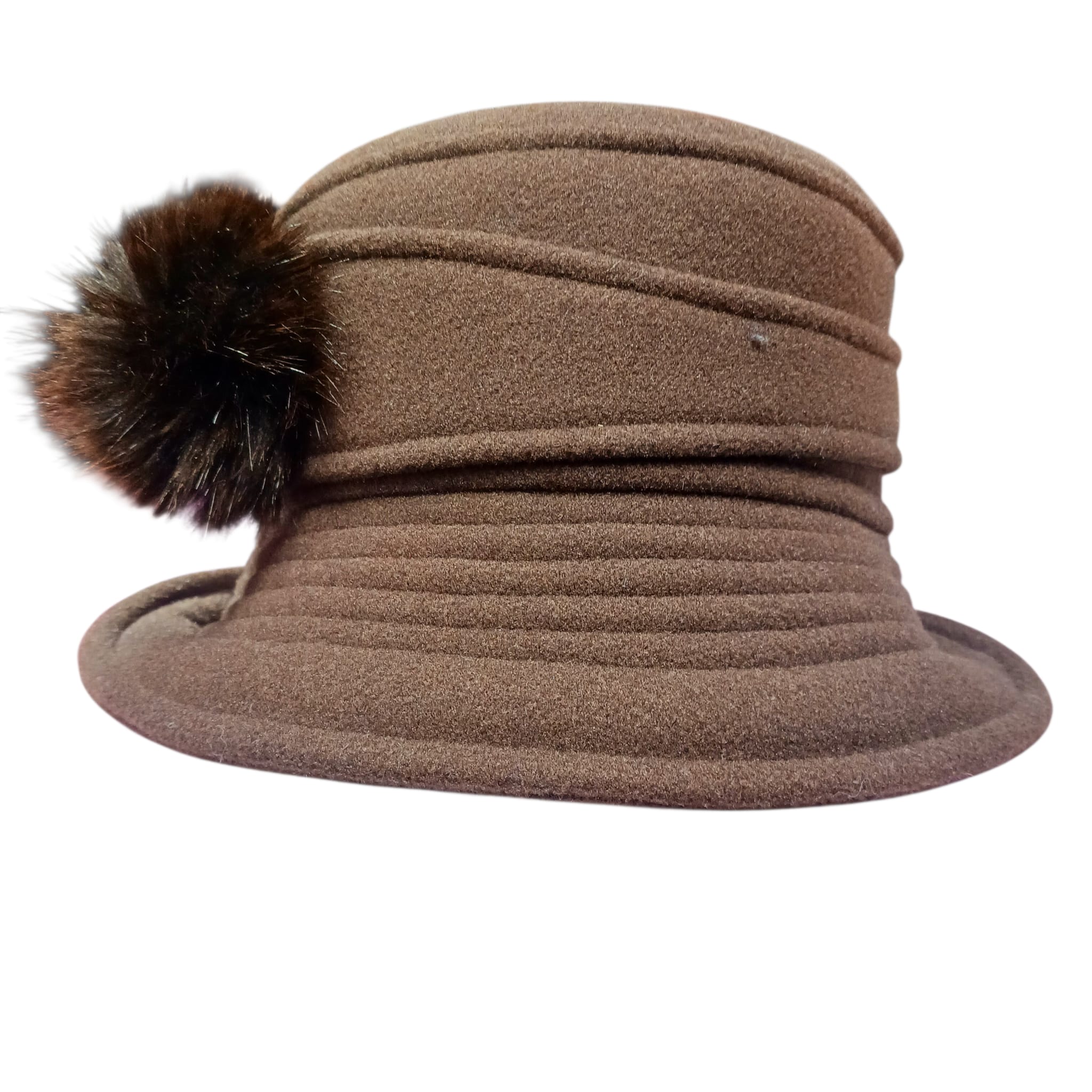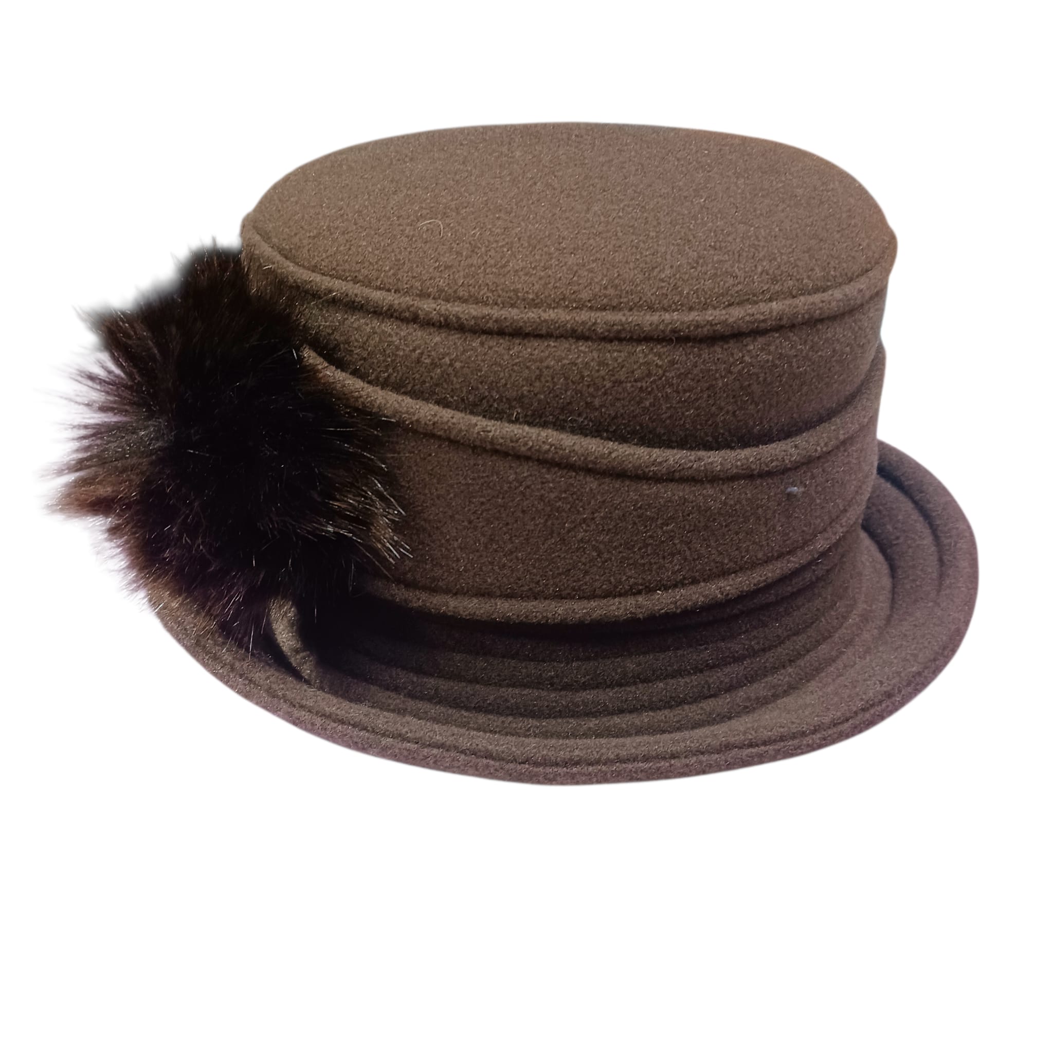 Pălărie elegantă de damă, tip cloche, realizată din material textil tip fetru sintetic, plăcut la atingere și rezistent. Model clasic, de culoare maro, accesorizat cu bandă decorativă și aplicație din blana pe lateral, care oferă un plus de rafinament.