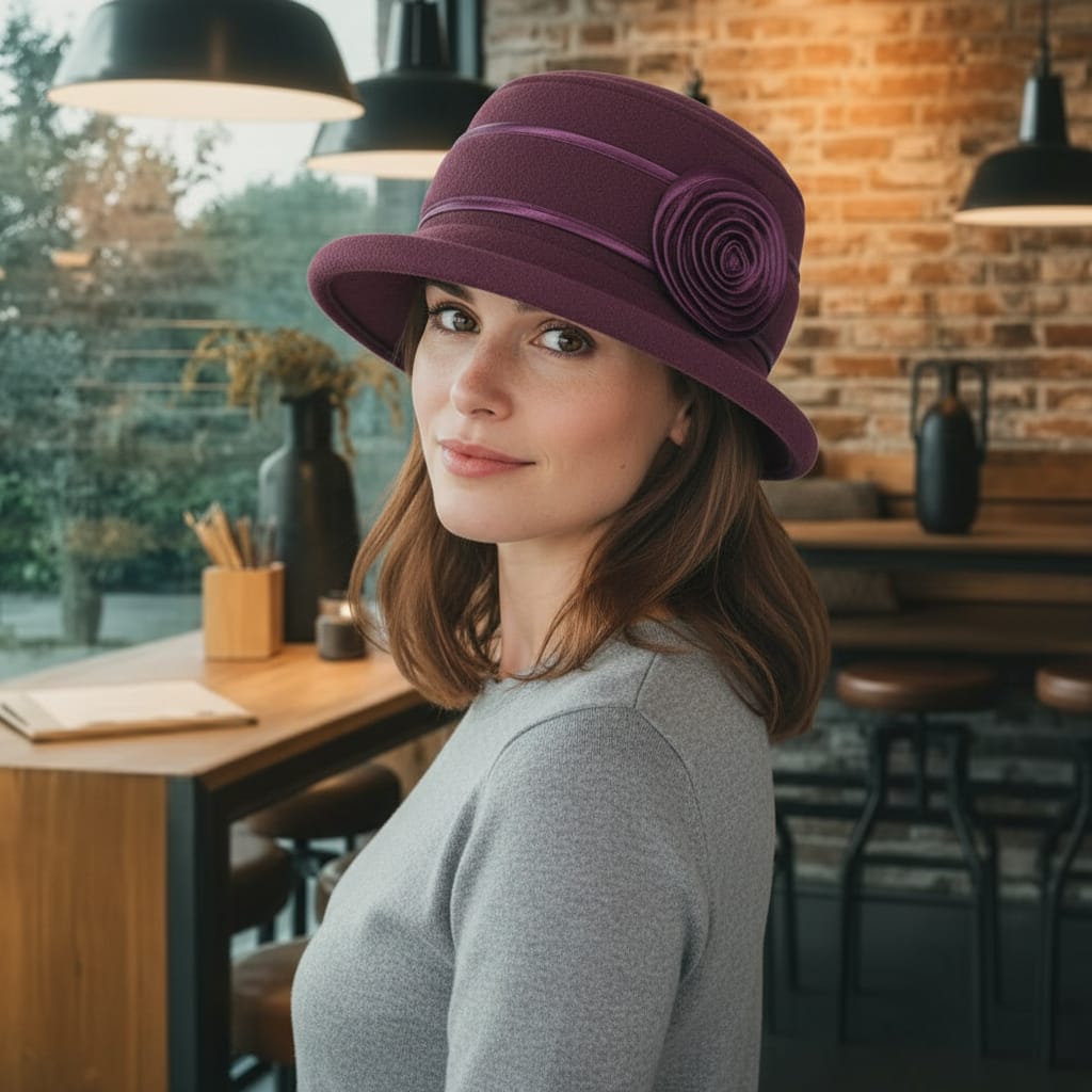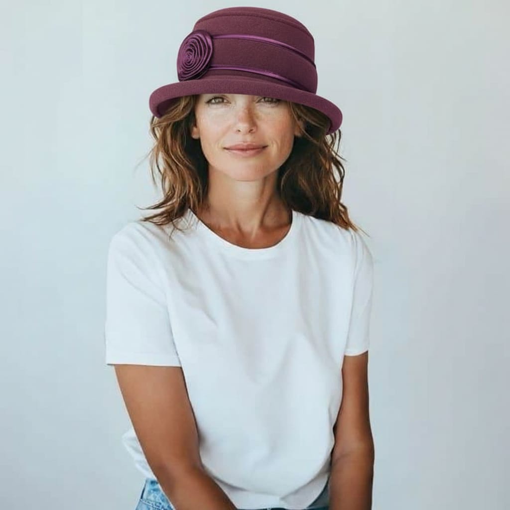 Pălărie elegantă de damă, tip cloche, realizată din material textil tip fetru sintetic, plăcut la atingere și rezistent. Model clasic, de culoare visinie, accesorizat cu bandă decorativă lucioasă și aplicație tip floare din saten pe lateral, care oferă un plus de rafinament.