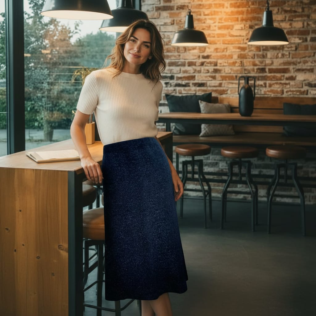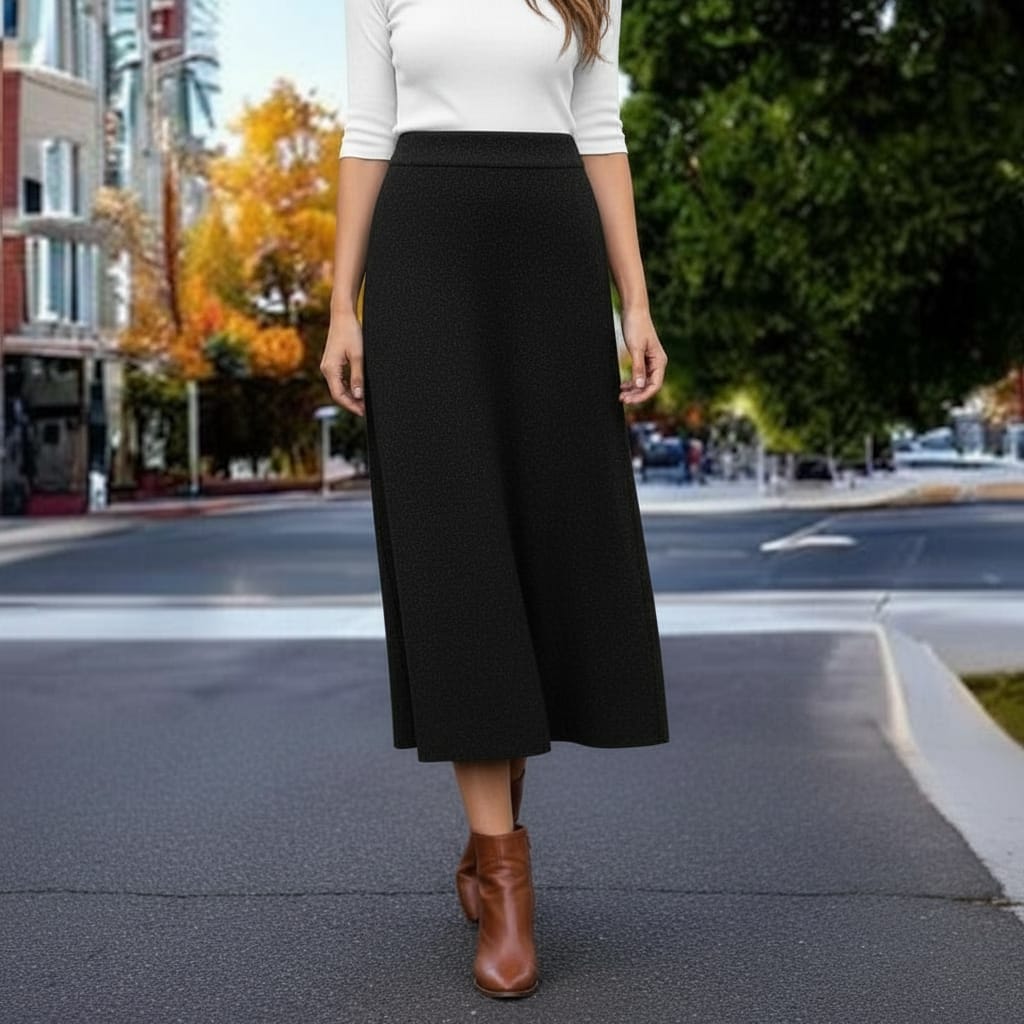 Fusta tricotata (bucle), fond negru, ce are marime unica potrivita pentru masurile; L,XL,2XL,