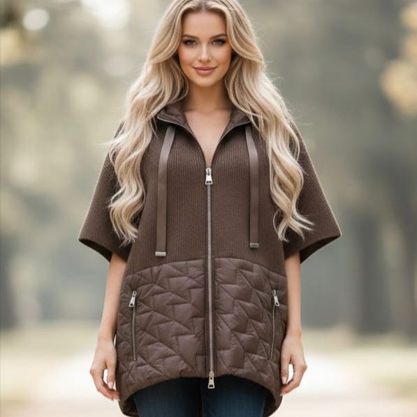 Această piesă vestimentară este o jachetă hibrid modernă de tip poncho sau vestă cu mânecă scurtă, ideală pentru ținute casual chic în perioadele de tranziție. Confort și eleganță într-o piesă versatilă, special creată pentru siluetele Plus Size.