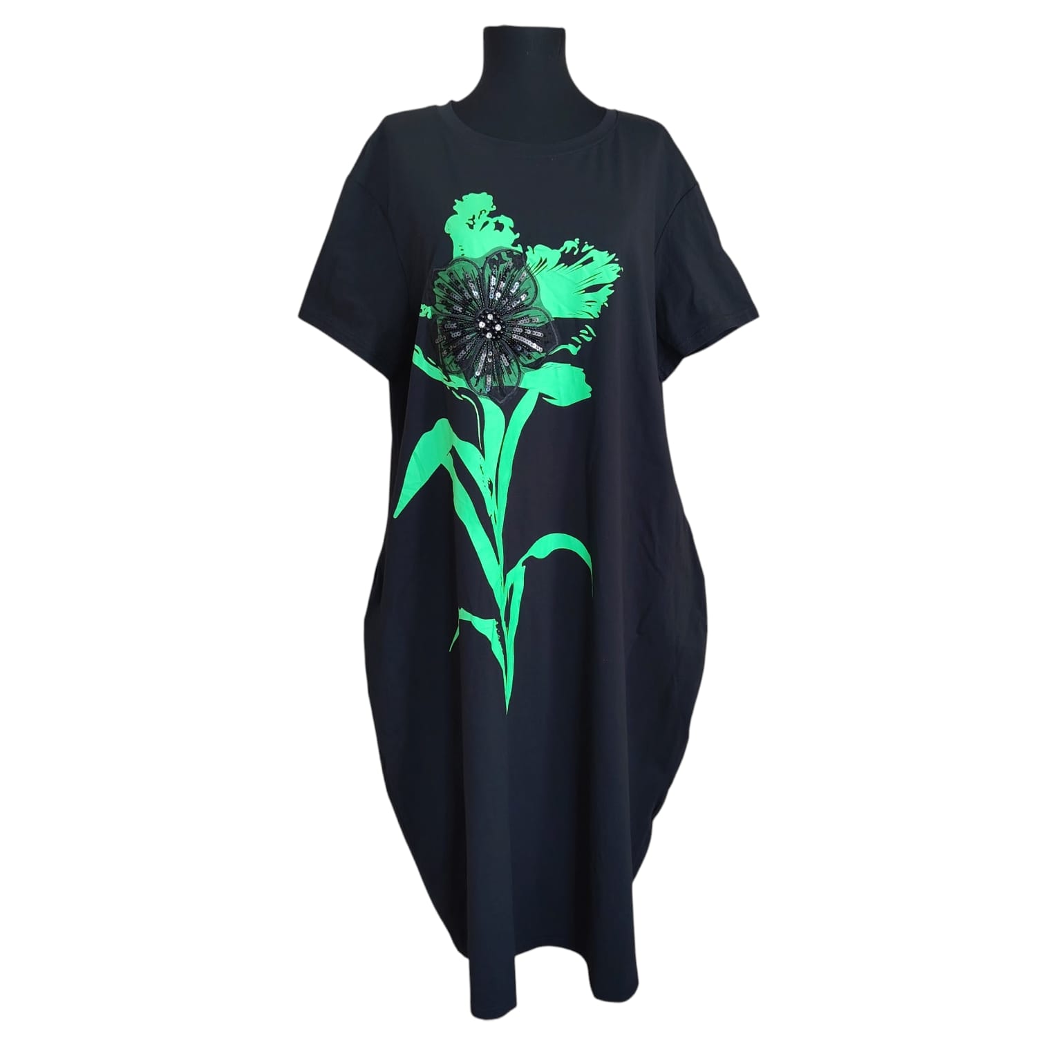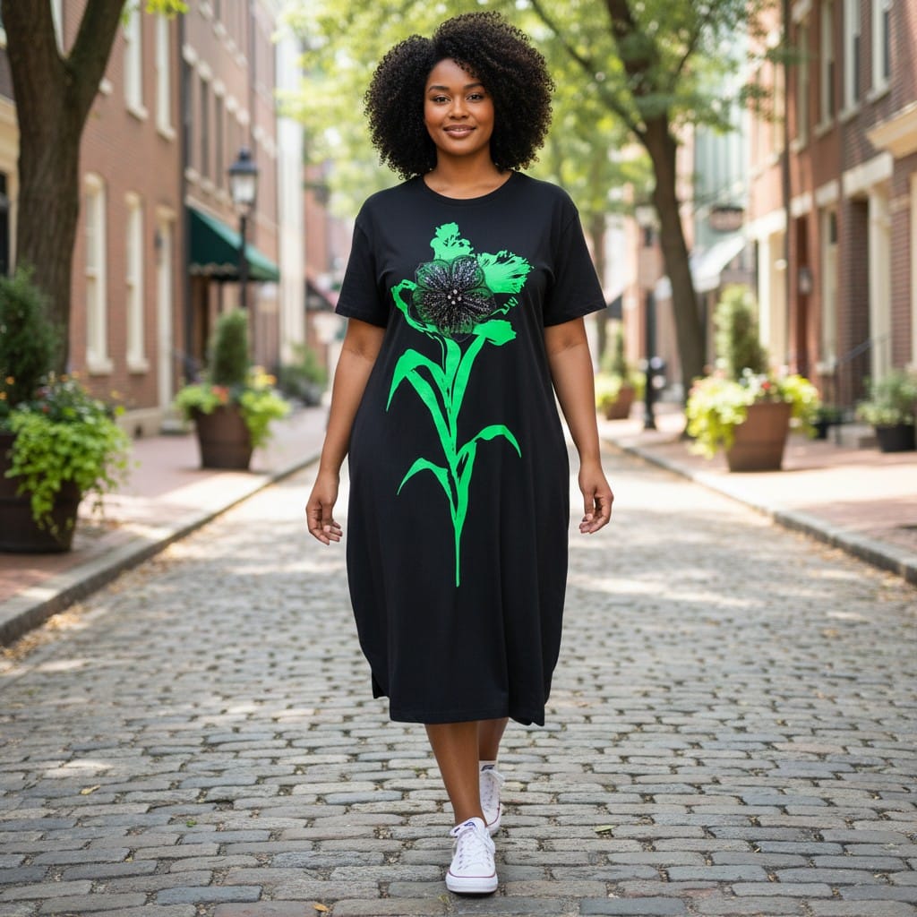 Această rochie midi redefinește confortul urban, adăugând o notă de eleganță artistică prin detaliile sale lucrate cu grijă. Realizată dintr-un amestec moale de bumbac și elastan, piesa se remarcă prin aplicația centrală spectaculoasă: o floare supradimensionată în nuanțe vibrante de verde.