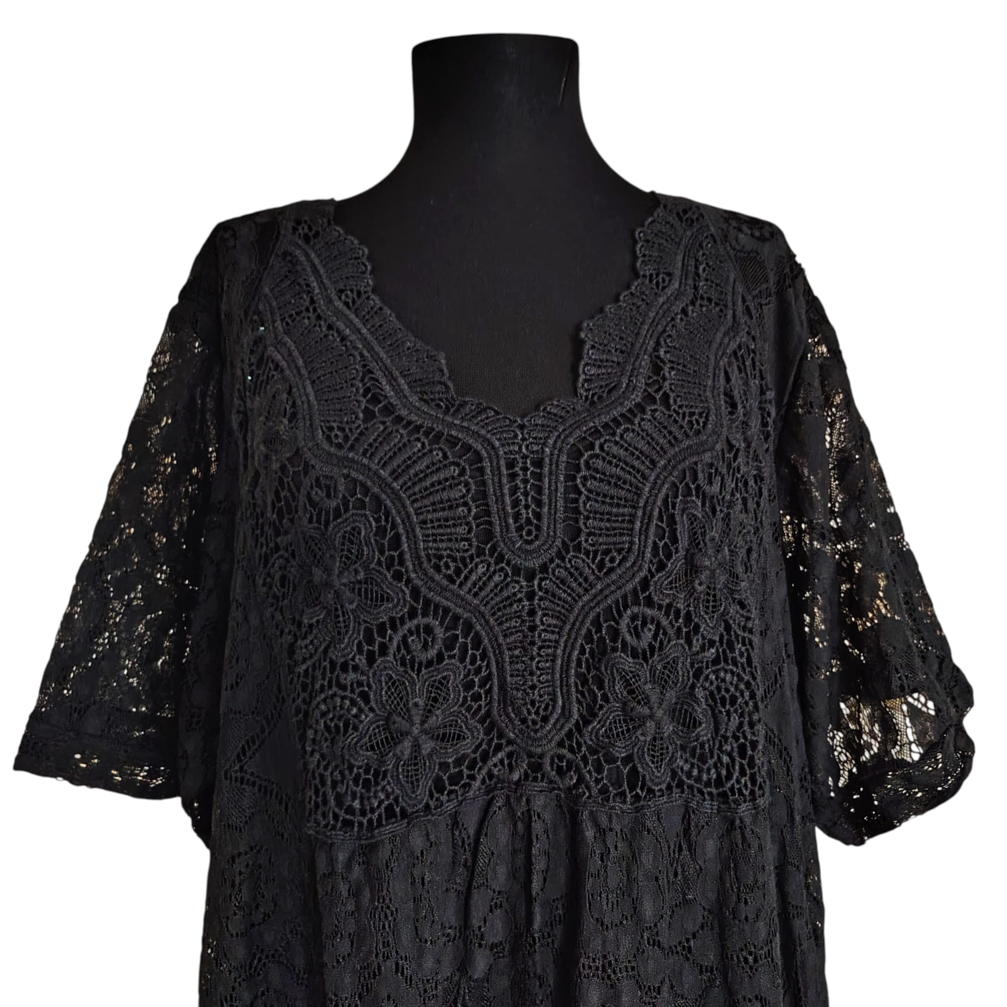- Bust brodat: Zona decolteului în „V” este pusă în valoare de o dantelă croșetată complexă, care adaugă o notă feminină și romantică.