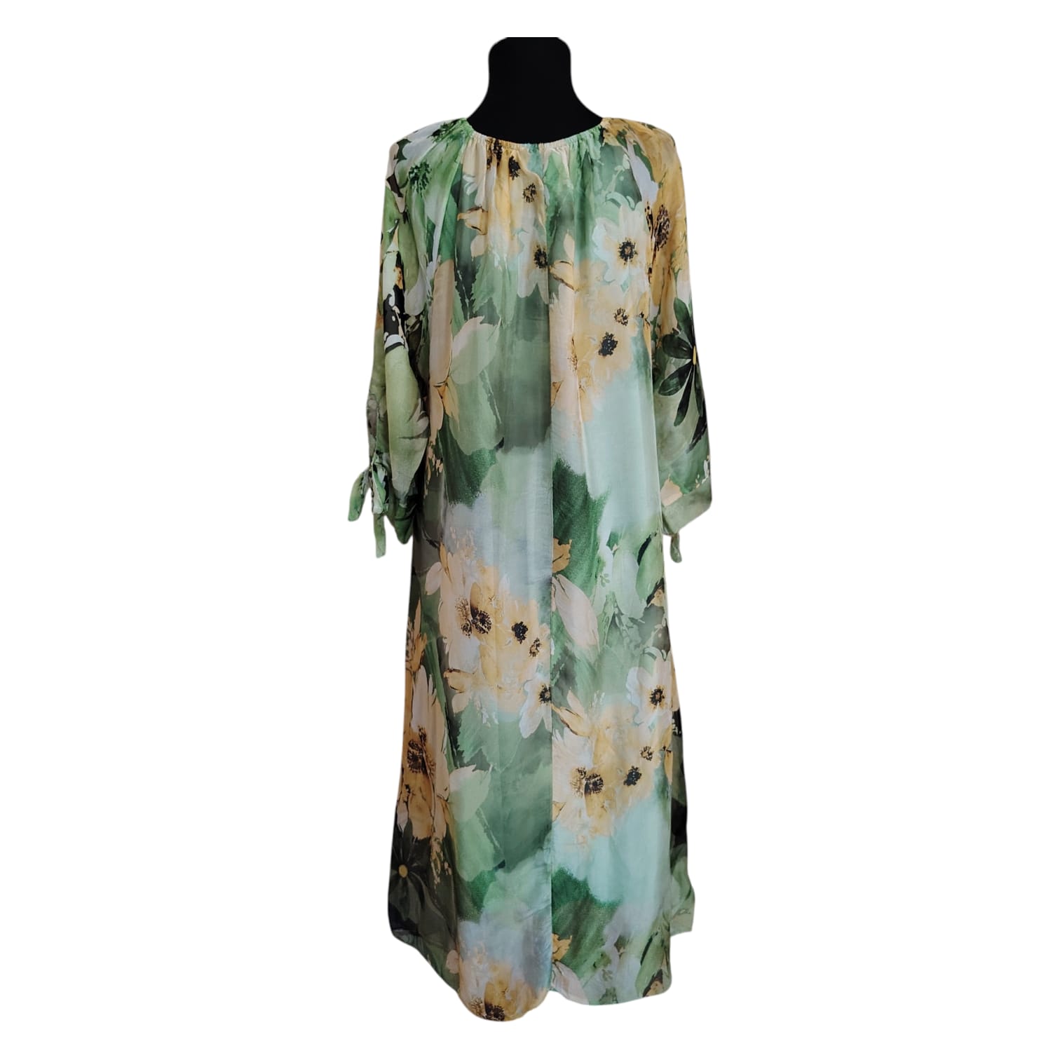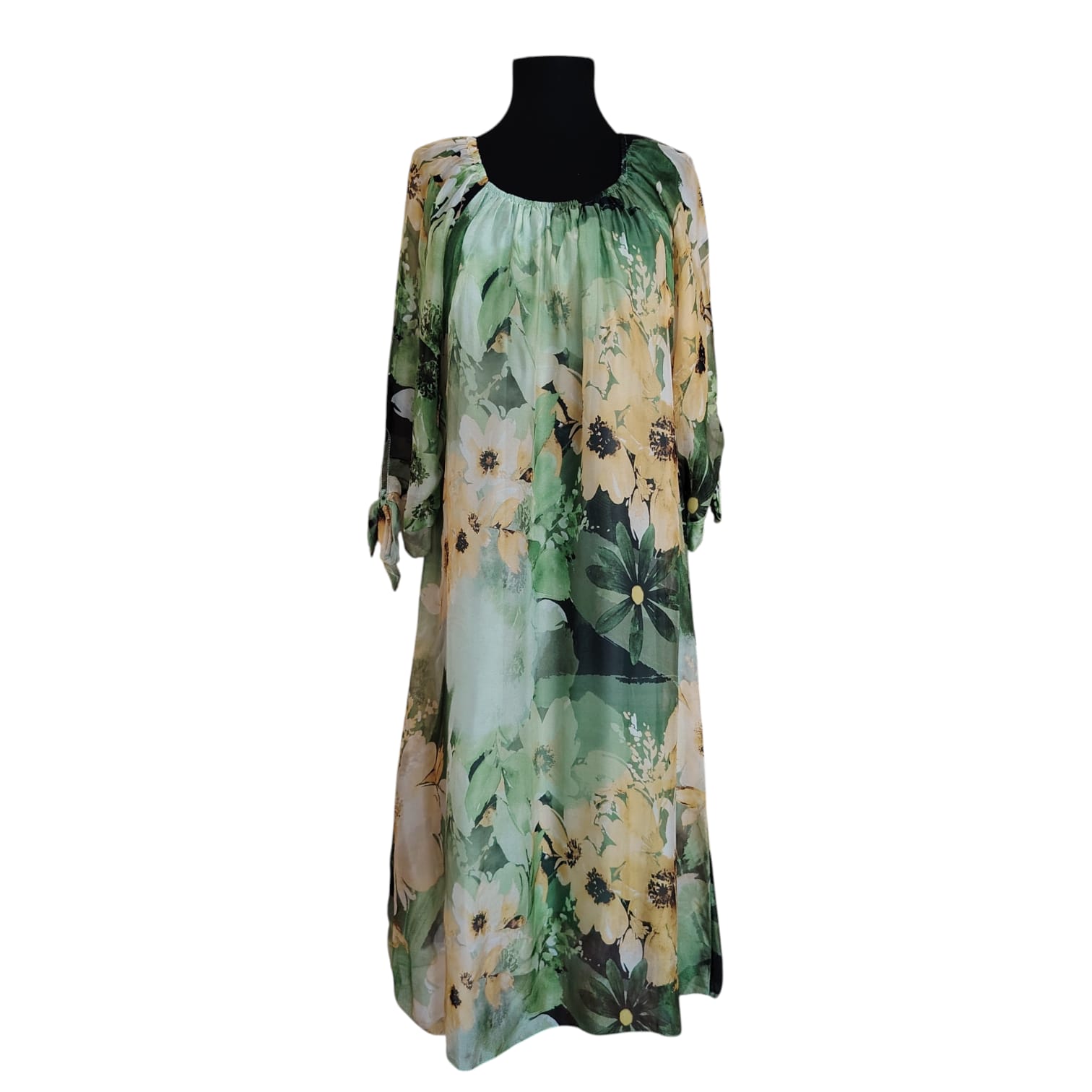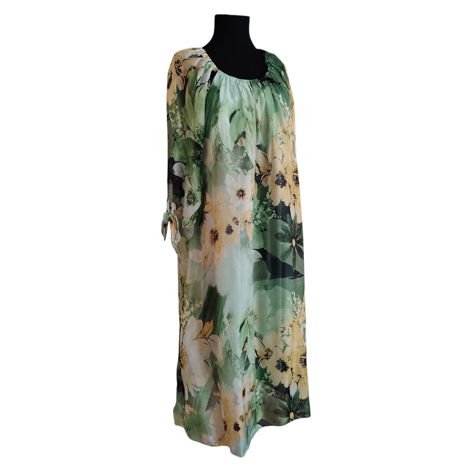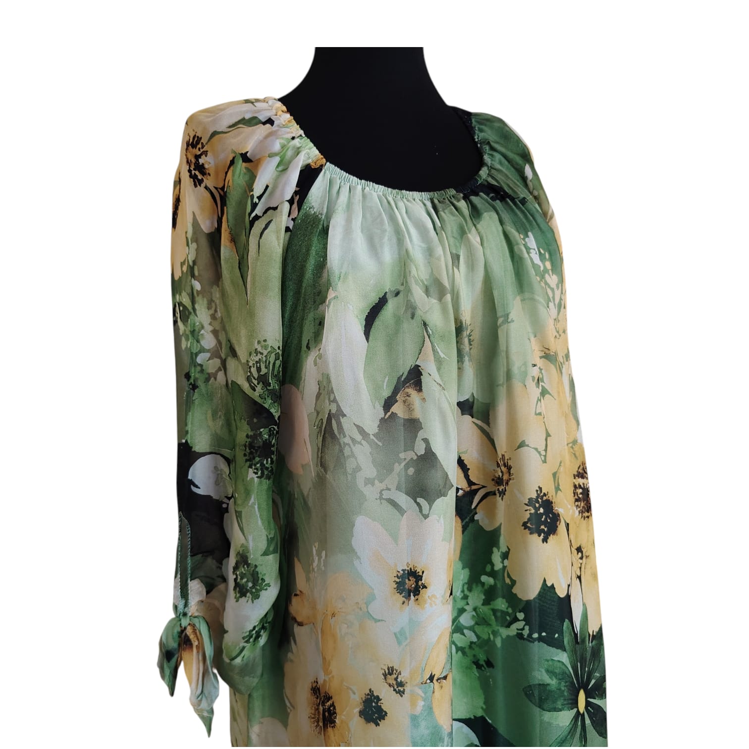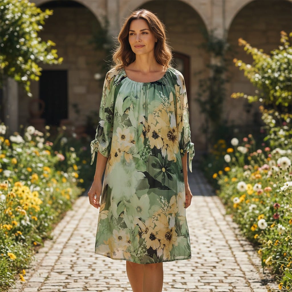 Imprimeul floral bogat, în nuanțe de verde proaspăt și accente de galben solar, emană o stare de prospețime și feminitate. Croiala lejeră și mânecile reglabile prin nod fac din această piesă o alegere versatilă, potrivită atât pentru evenimente de zi, cât și pentru o ieșire relaxată.