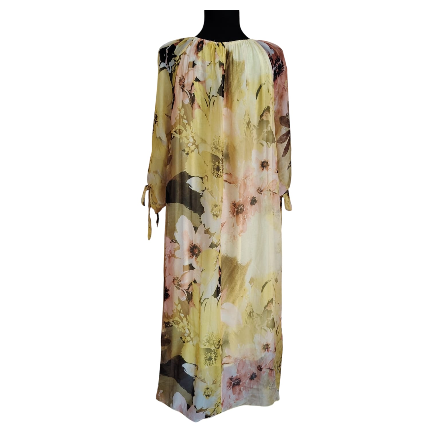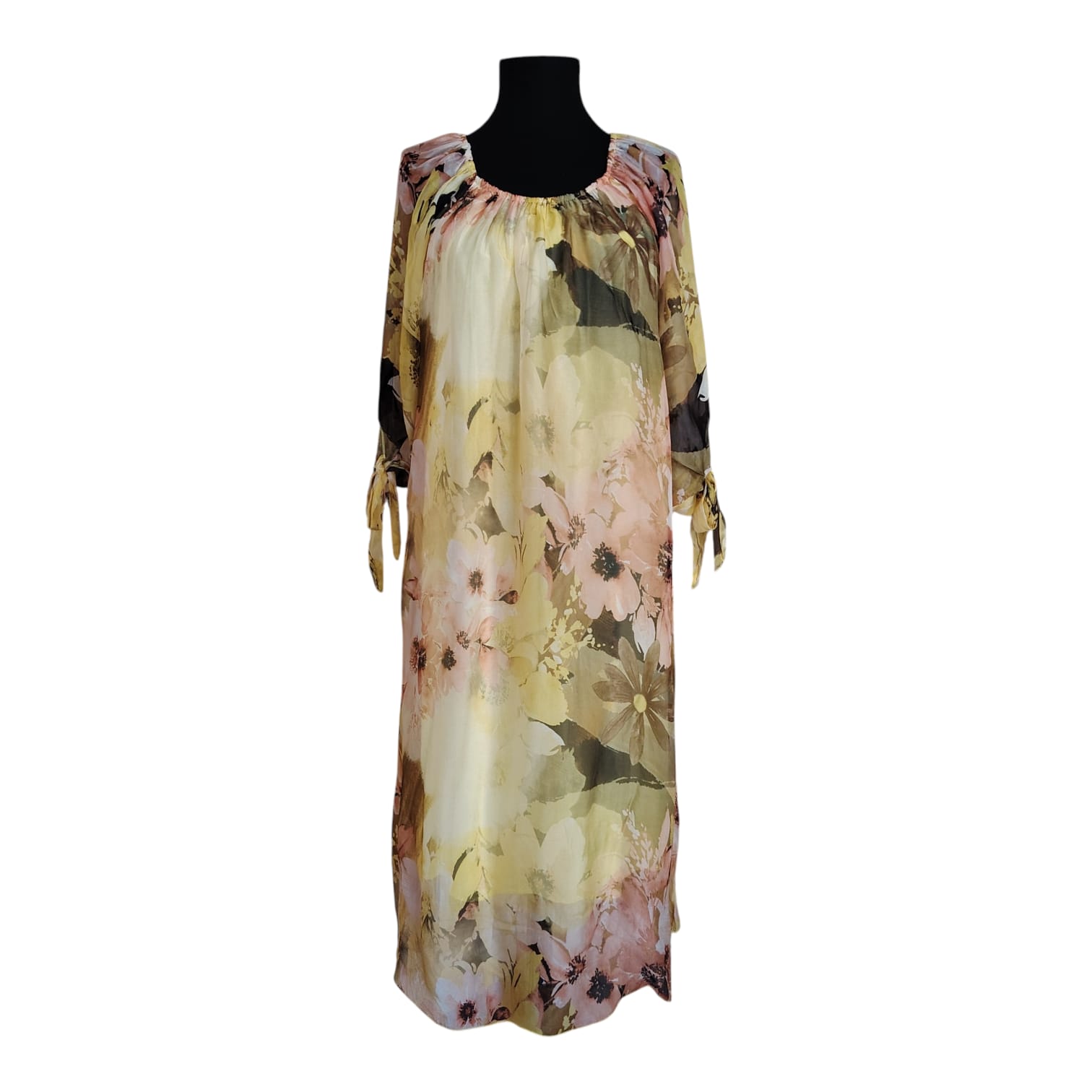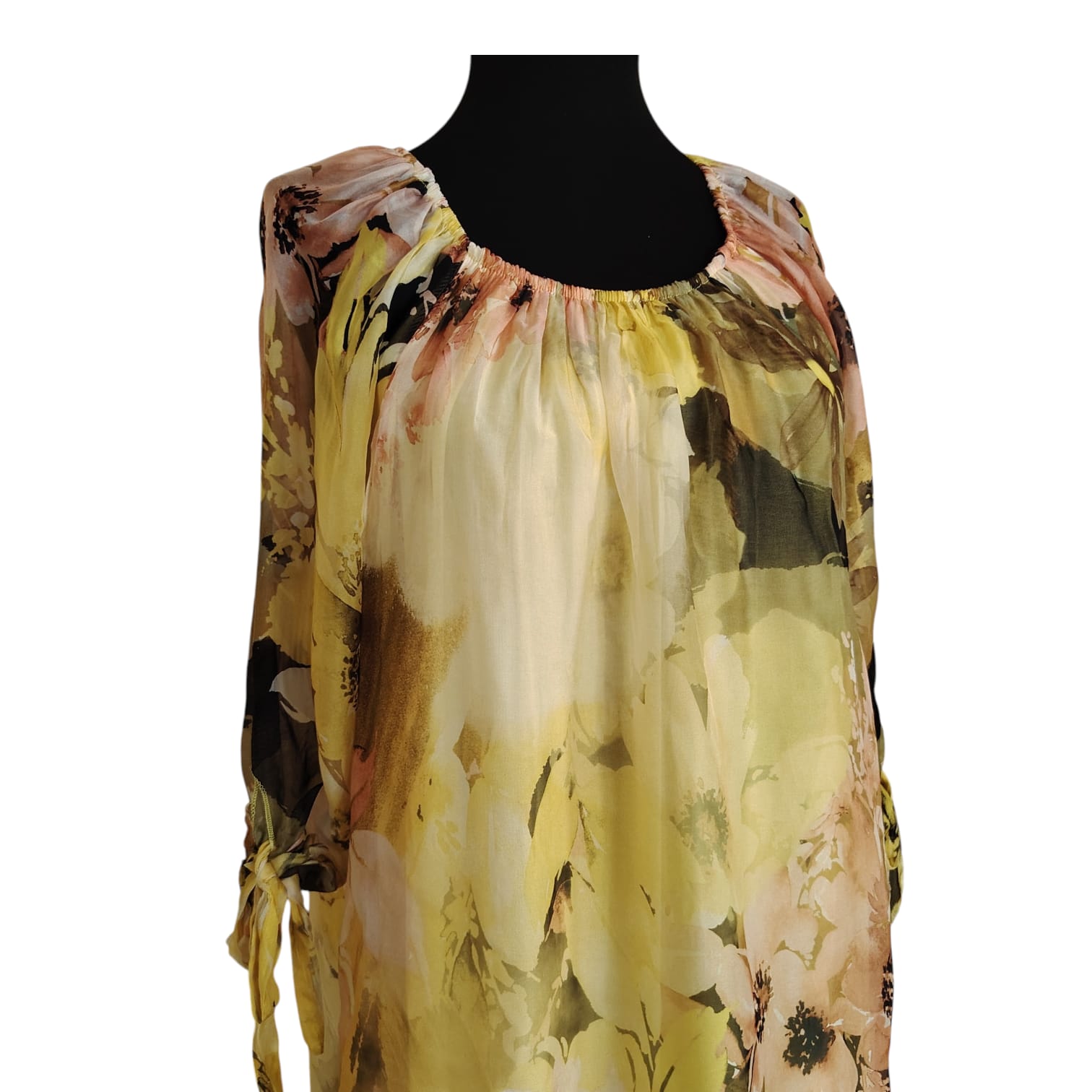 Adaugă o pată de lumină garderobei tale cu această rochie midi fluidă, realizată dintr-o combinație nobilă de mătase și viscoză. Imprimeul floral supradimensionat, în tonuri calde de galben pai, vernil, piersică delicată și accente de salvie, creează un look diafan și extrem de feminin.