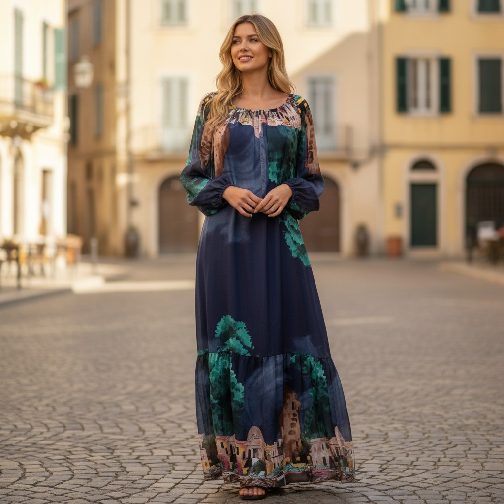 Această rochie lungă din mătase naturală impresionează prin imprimeul peisaj vibrant și croiala lejeră, fluidă. Designul rafinat, în nuanțe predominante de albastru, bleo și turcoaz oferă o alură elegantă și feminină, perfectă pentru o apariție sofisticată sau un eveniment special. Materialul pur din mătase asigură un confort desăvârșit și o cădere impecabilă pe corp, remarcându-se prin calitatea superioară.