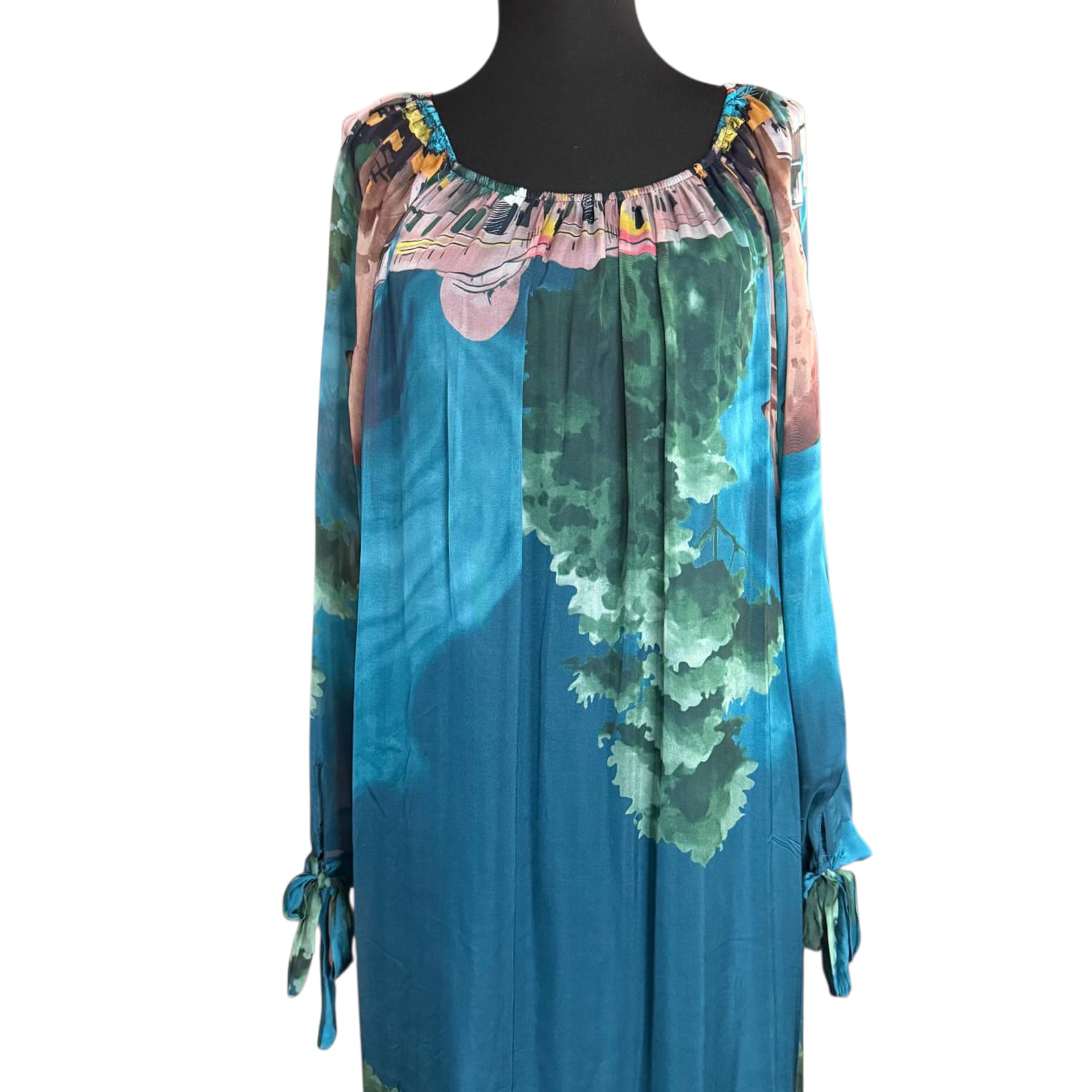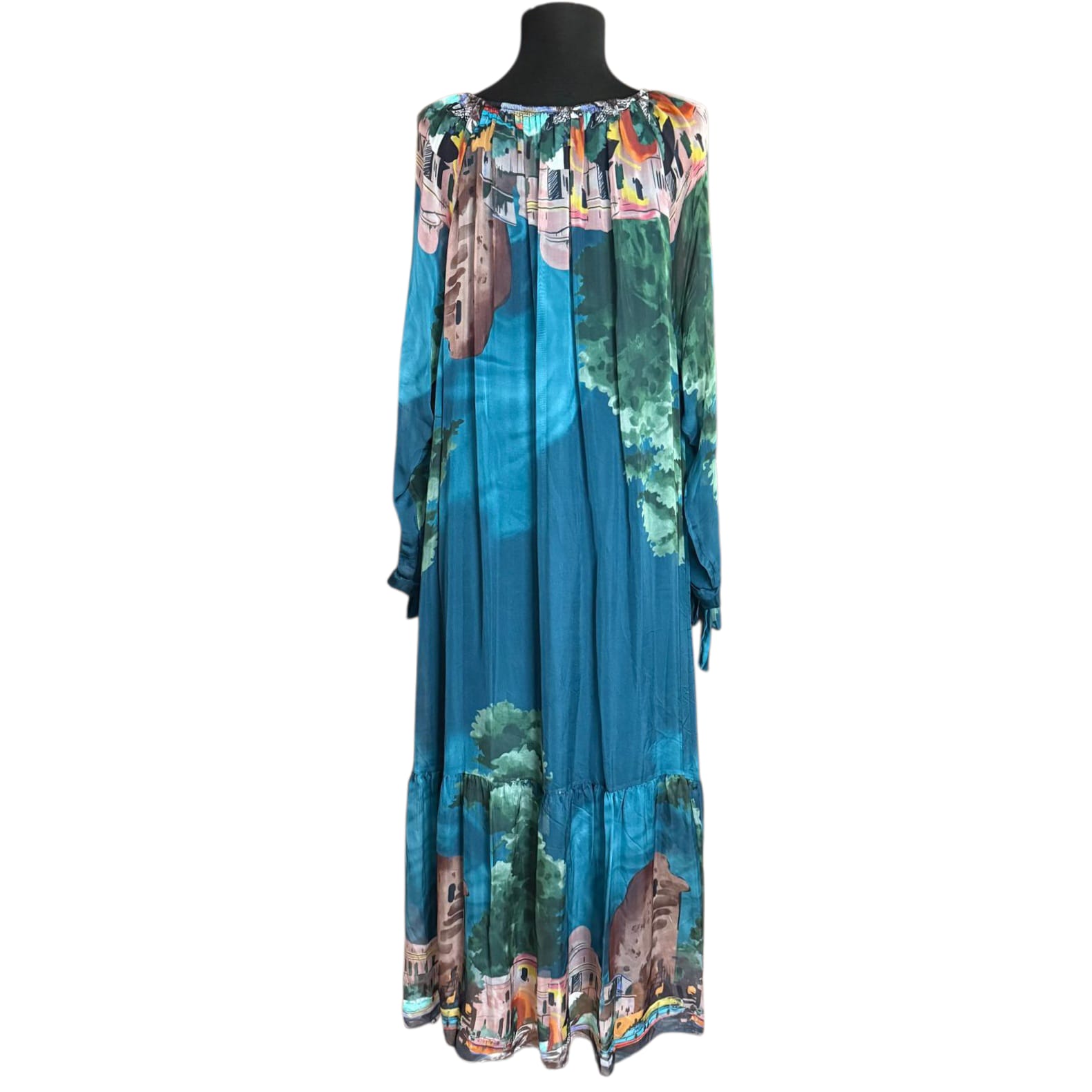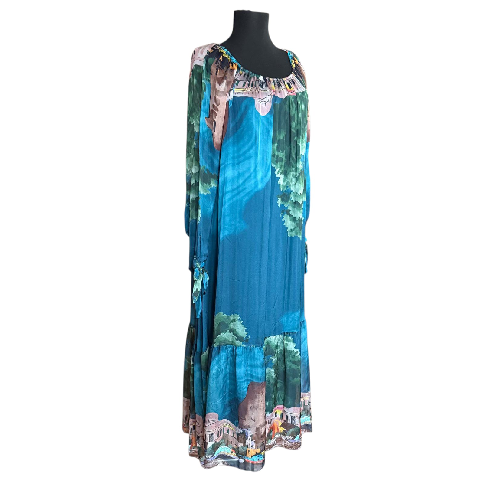 Această rochie lungă din mătase naturală impresionează prin imprimeul peisaj vibrant și croiala lejeră, fluidă. Designul rafinat, în nuanțe predominante de albastru, bleo și turcoaz oferă o alură elegantă și feminină, perfectă pentru o apariție sofisticată sau un eveniment special. Materialul pur din mătase asigură un confort desăvârșit și o cădere impecabilă pe corp, remarcându-se prin calitatea superioară.