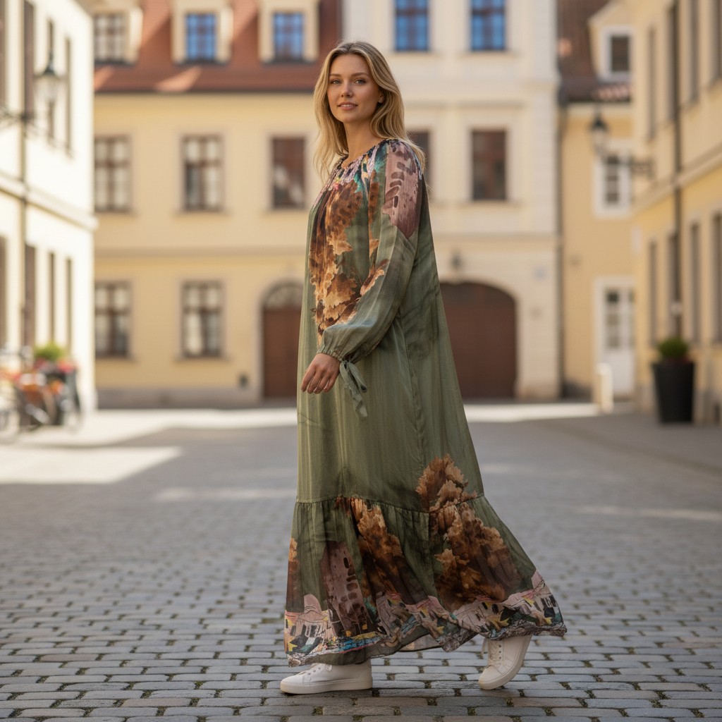 Această rochie lungă din mătase naturală impresionează prin imprimeul peisaj vibrant și croiala lejeră, fluidă. Designul rafinat, în nuanțe predominante de oliv si maro oferă o alură elegantă și feminină, perfectă pentru o apariție sofisticată sau un eveniment special. Materialul pur din mătase asigură un confort desăvârșit și o cădere impecabilă pe corp, remarcându-se prin calitatea superioară.