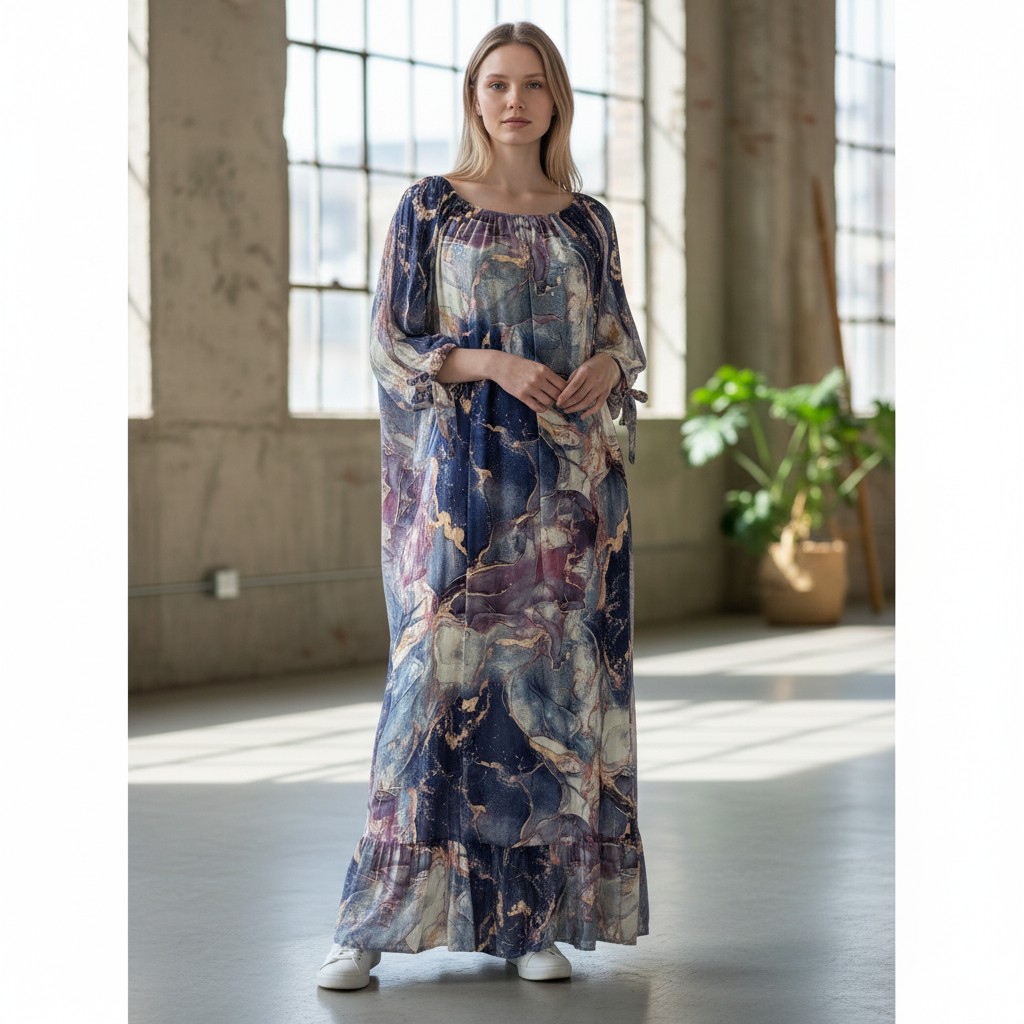 - Croială Fluidă: Modelul maxi, lejer, cu mâneci 3/4 și manșete reglabile, asigură o siluetă feminină și confortabilă.