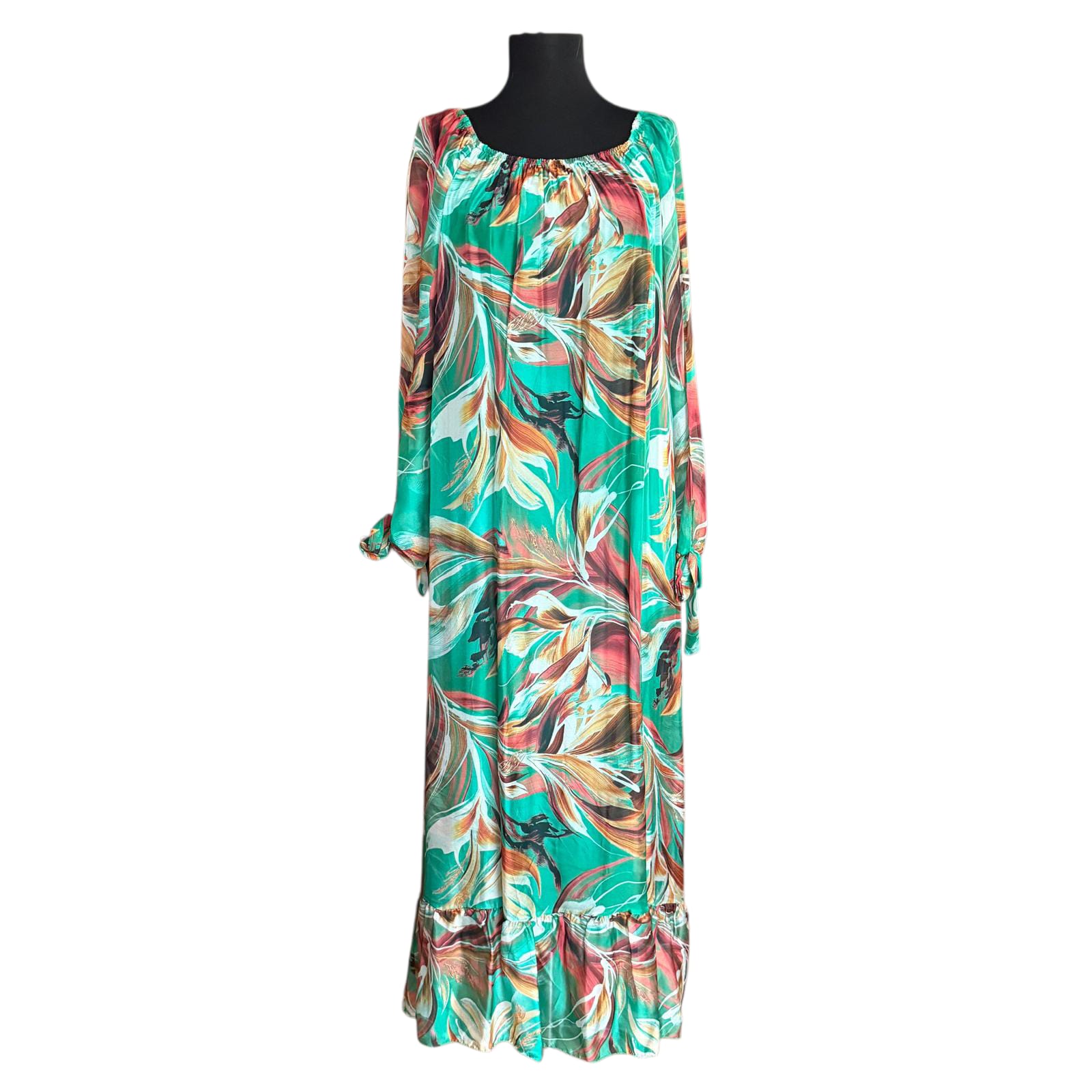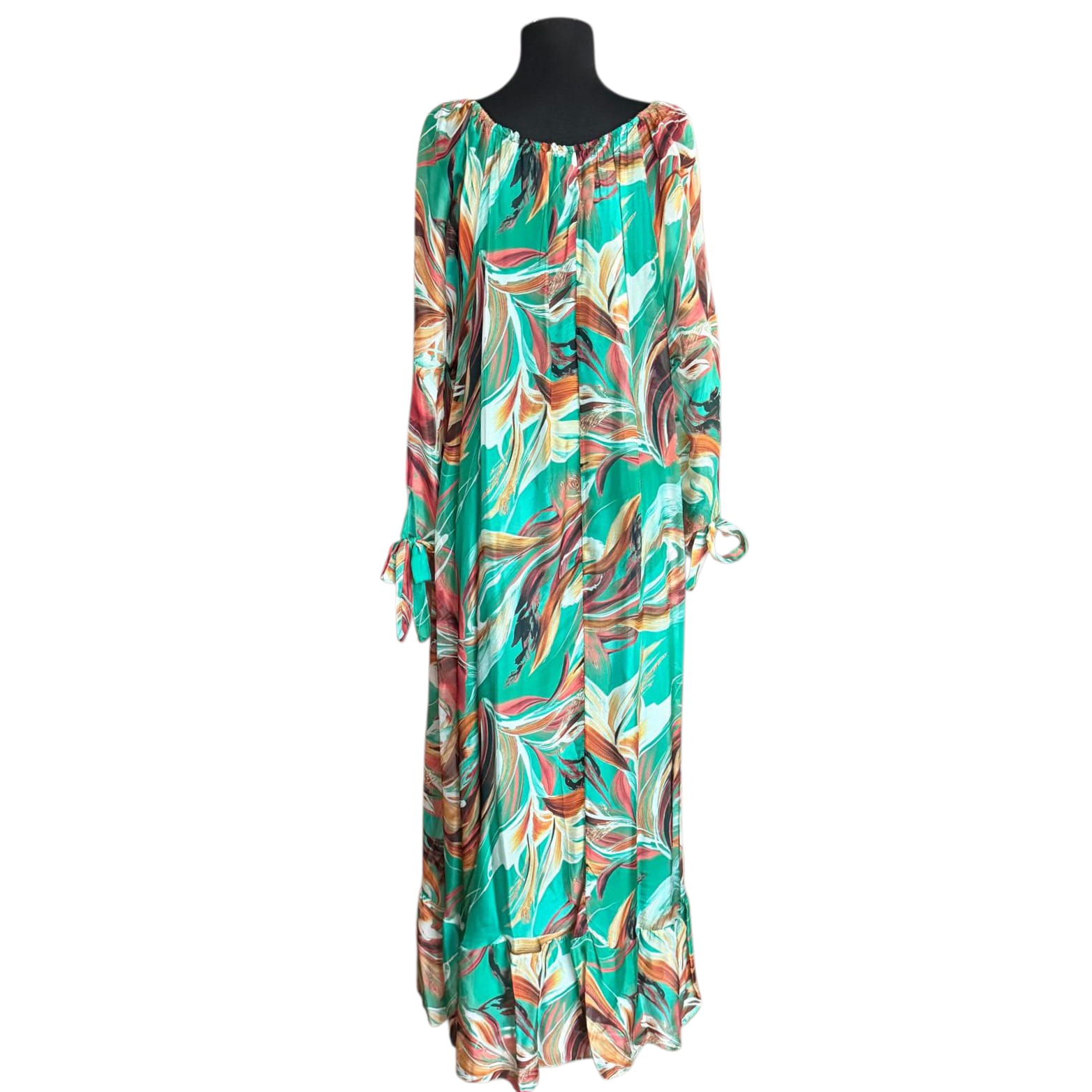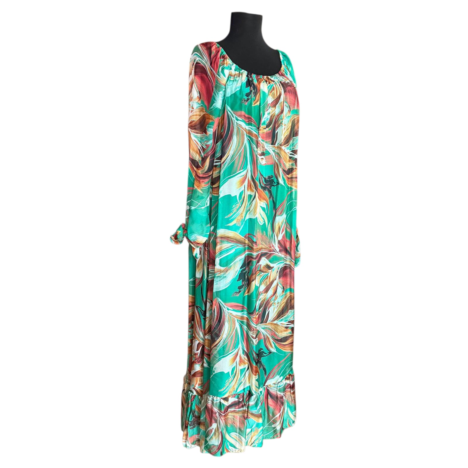 • Detalii Elegante: Prezintă mâneci lungi cu manșete ce se leaga și un decolteu rotund. Croiala maxi, evazată, cu volan la bază, adaugă un farmec aparte siluetei.