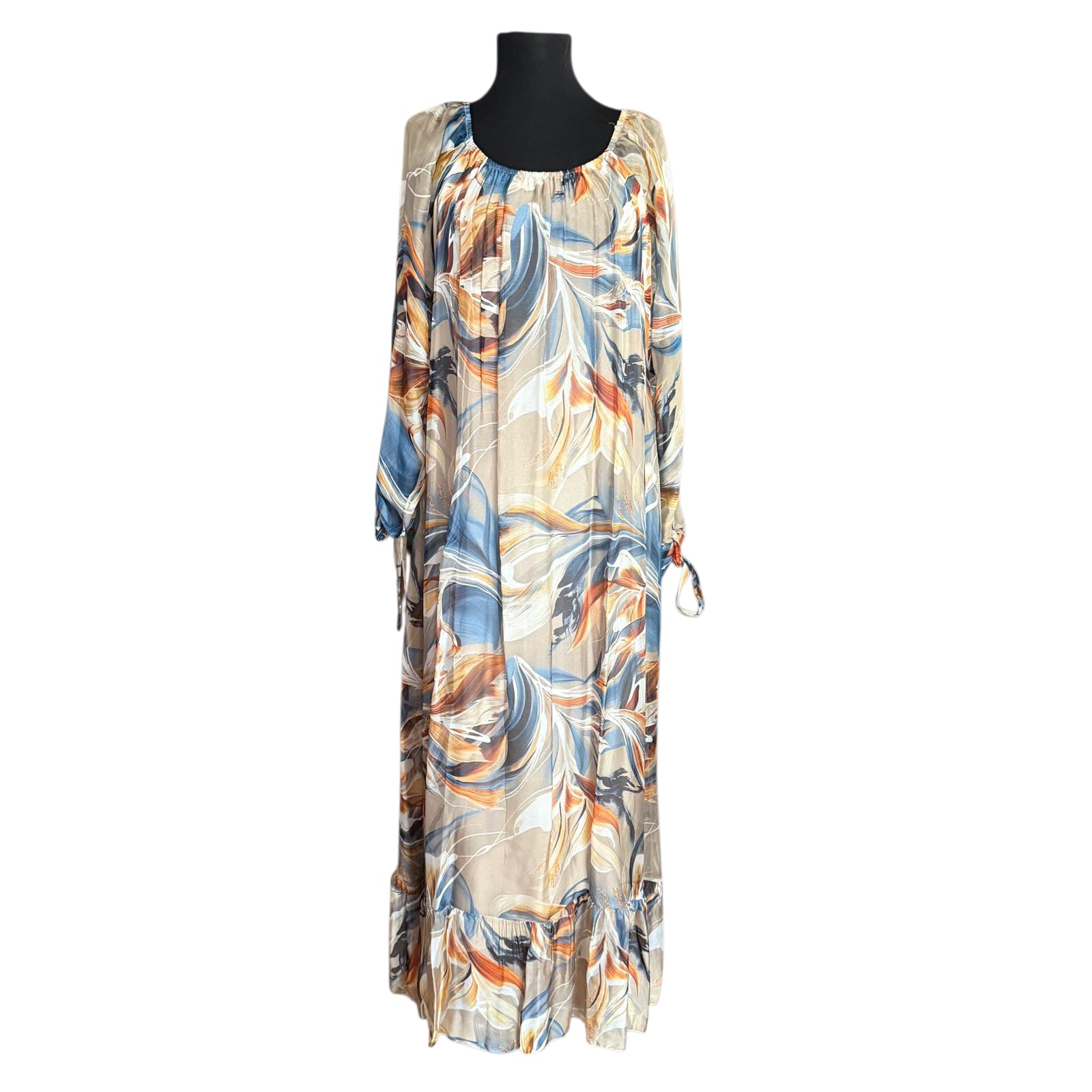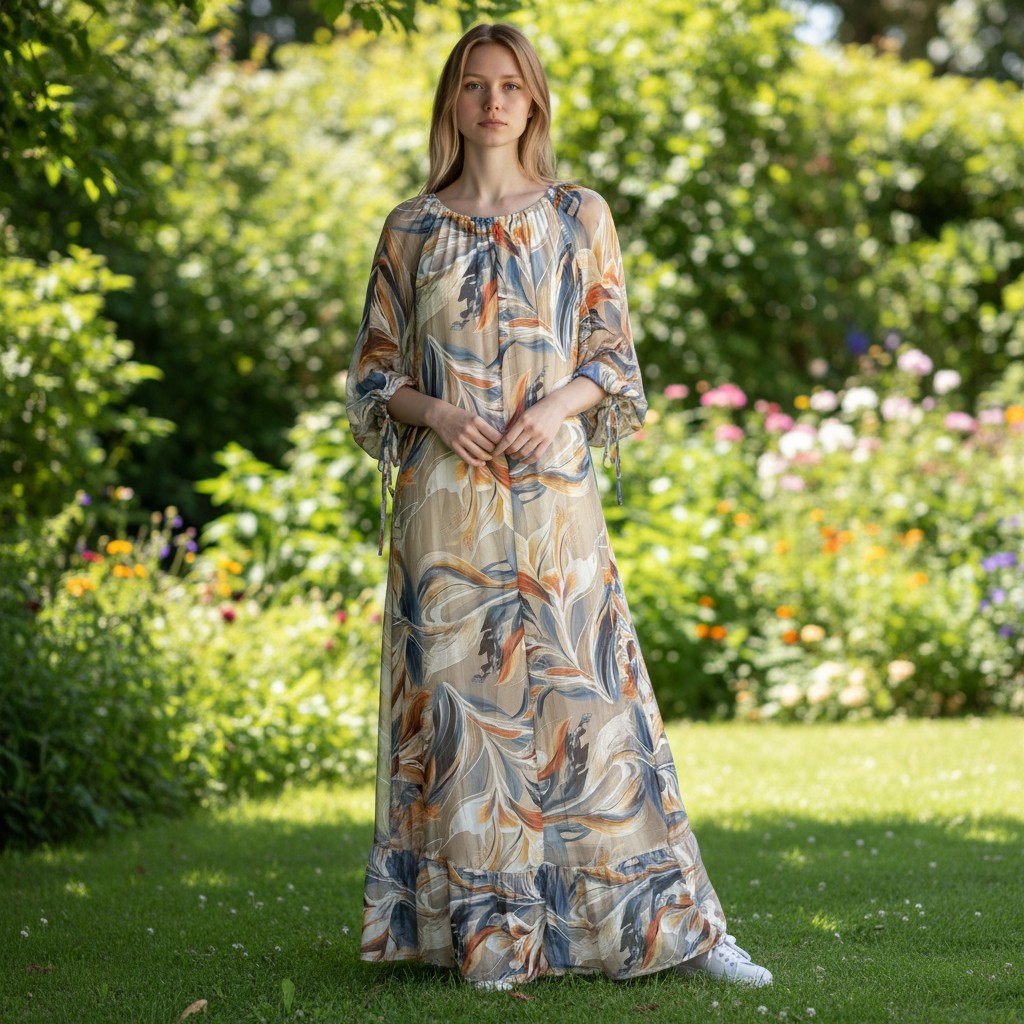 Explorează eleganța boemă cu această rochie maxi excepțională, o piesă vestimentară care combină confortul cu un stil sofisticat. Perfectă pentru o ocazie specială sau pentru a adăuga un accent original ținutei tale de zi cu zi, rochia se remarcă prin croiala sa fluidă și imprimeul vibrant.