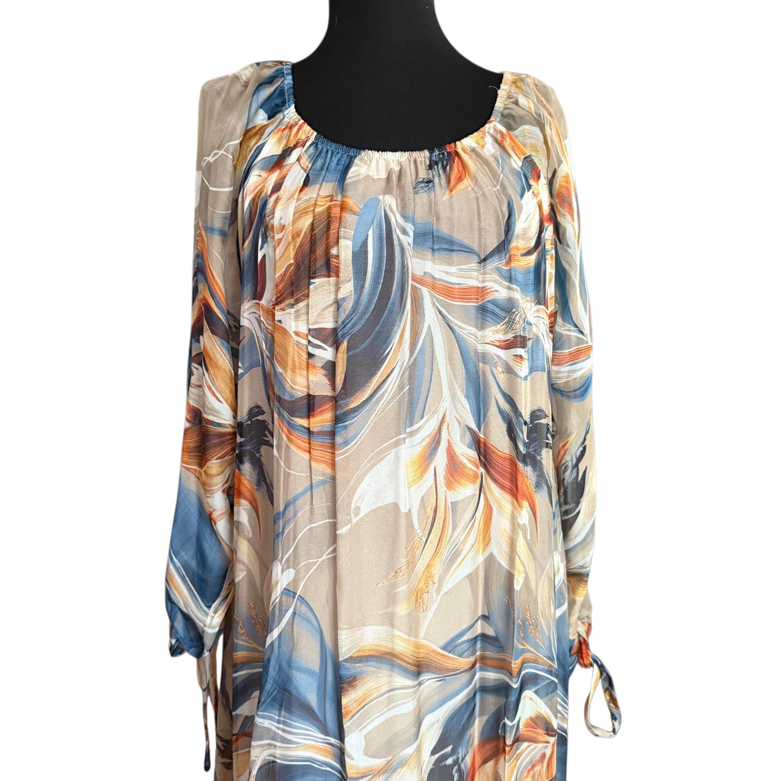 • Imprimeu Abstract: Modelul în nuanțe de bej/crem, albastru denim, portocaliu ars și maro deschis aduce un aer proaspăt și modern, fiind o piesă care atrage privirile.