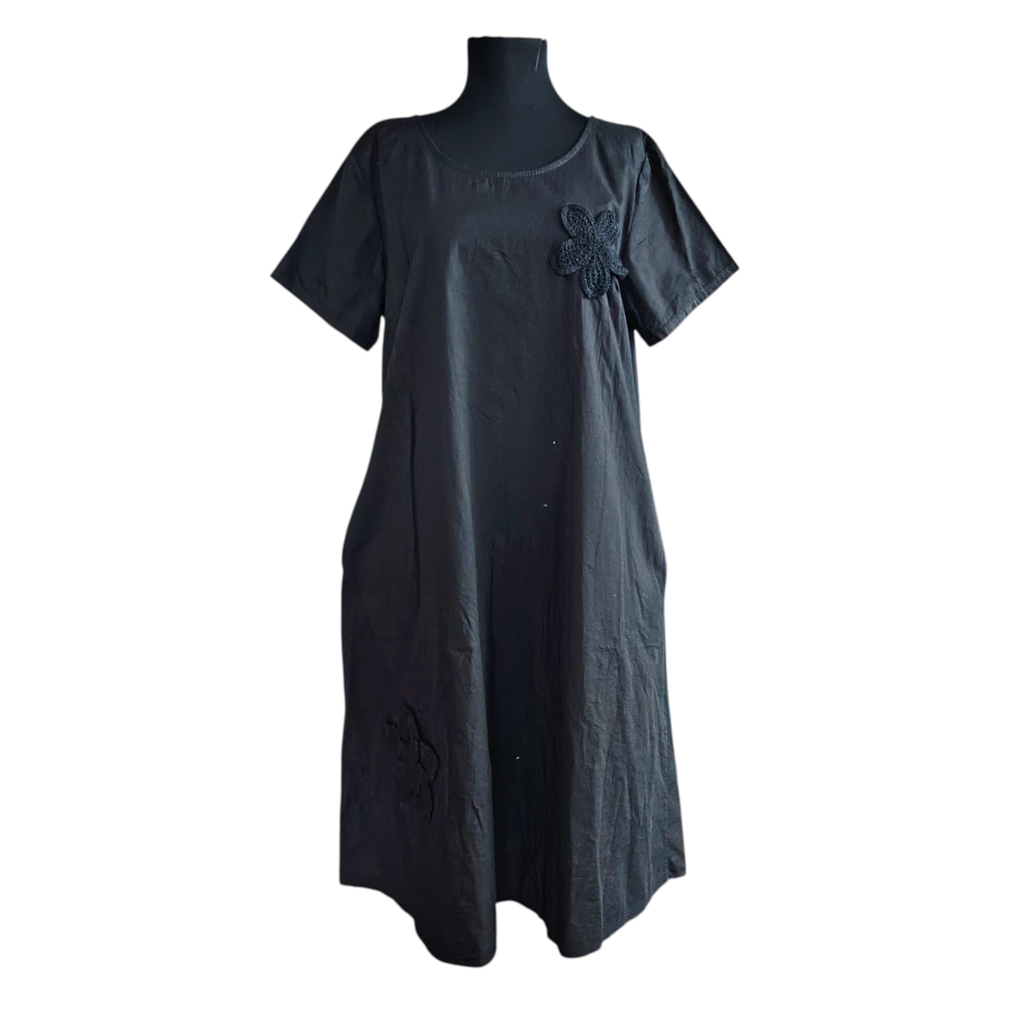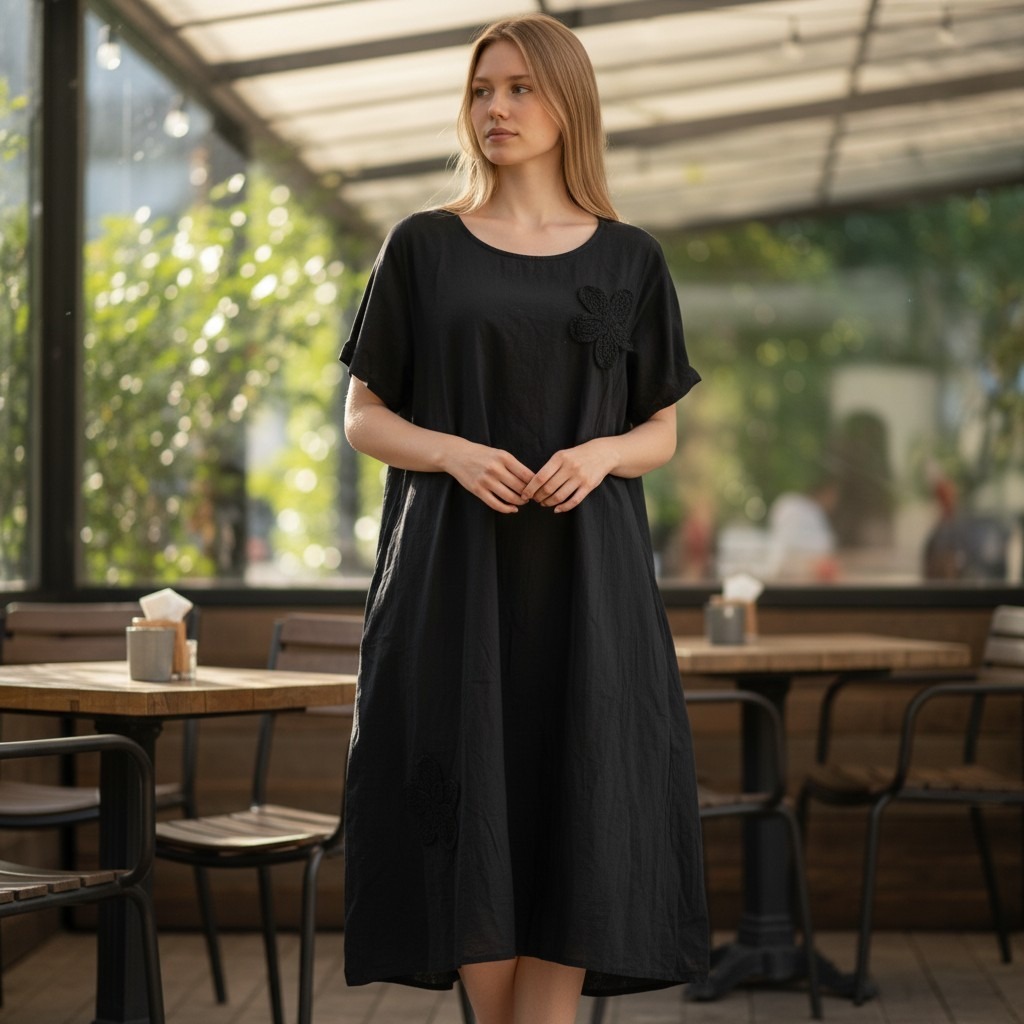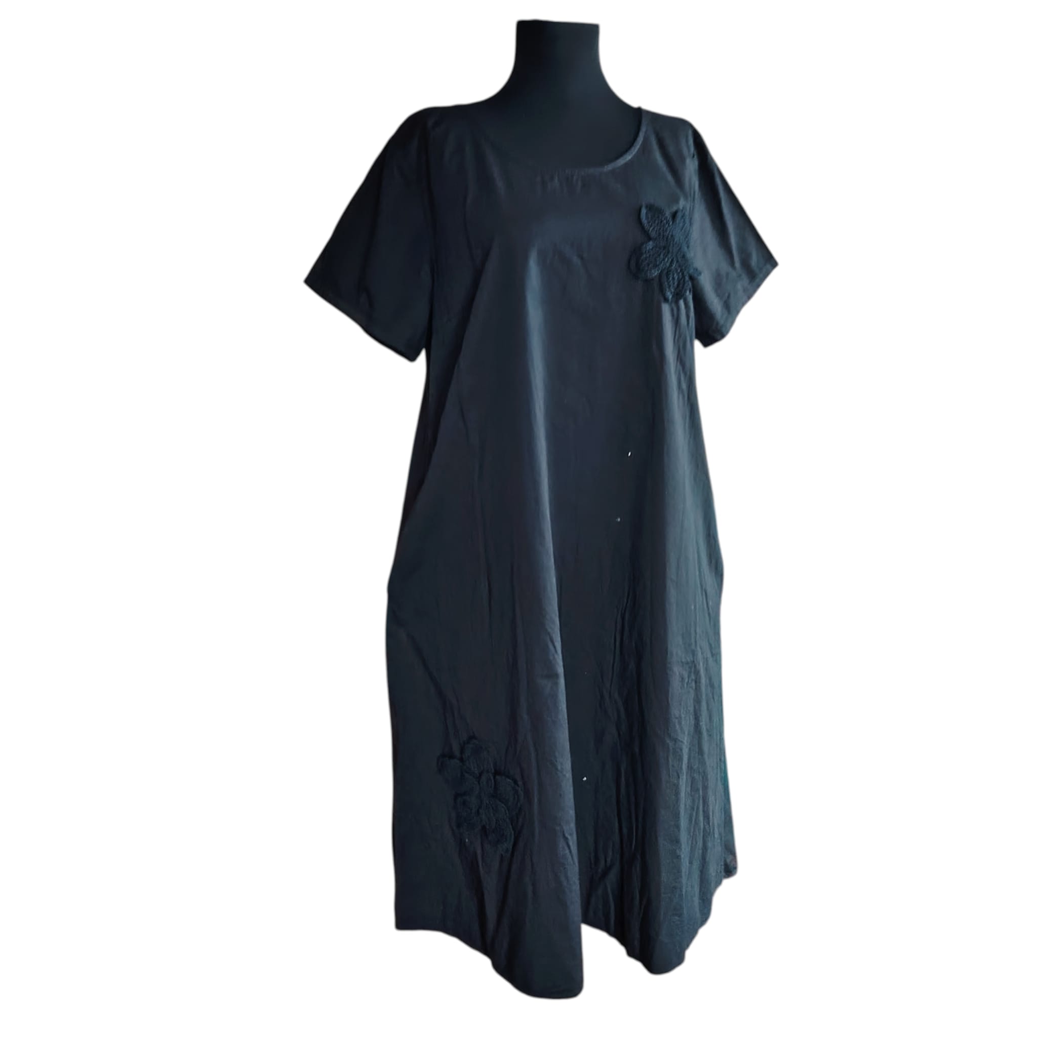 Descoperă echilibrul perfect între confort și feminitate! Această rochie midi, cu o croială lejeră și relaxată, este piesa pe care o vei alege ori de câte ori vrei să te simți bine și să arăți impecabil. Nuanța de Negru Clasic: Eleganța supremă. O piesă de bază care subțiază silueta și poate fi accesorizată în nenumărate feluri. dar și detaliile florale texturate aduc un plus de farmec oricărei zile.