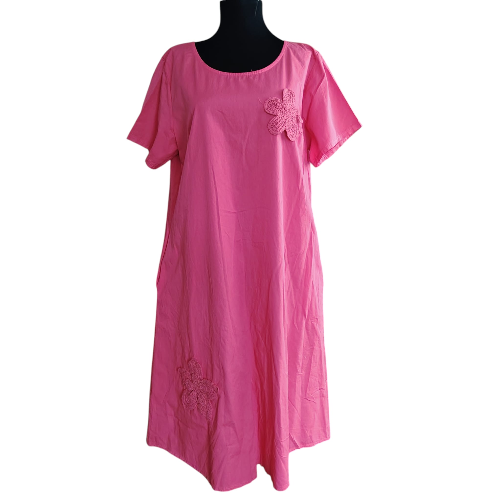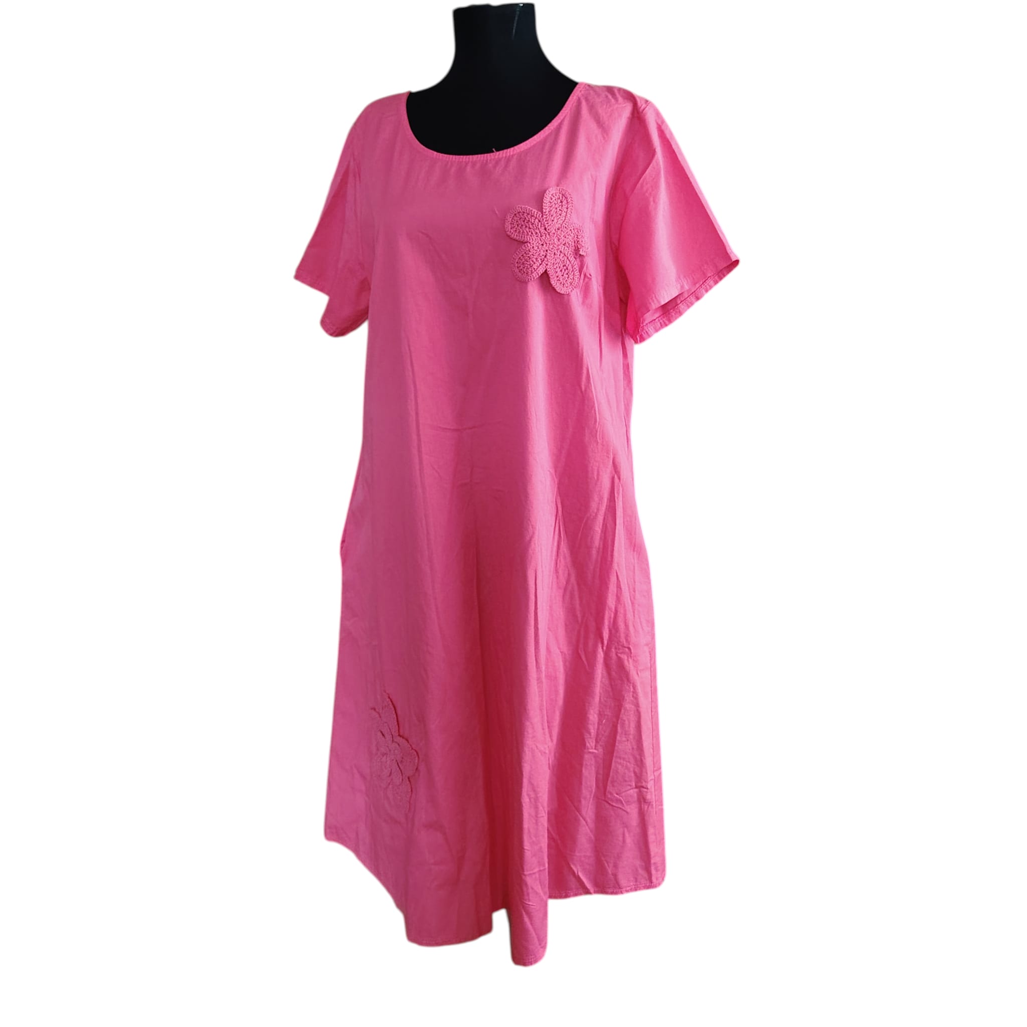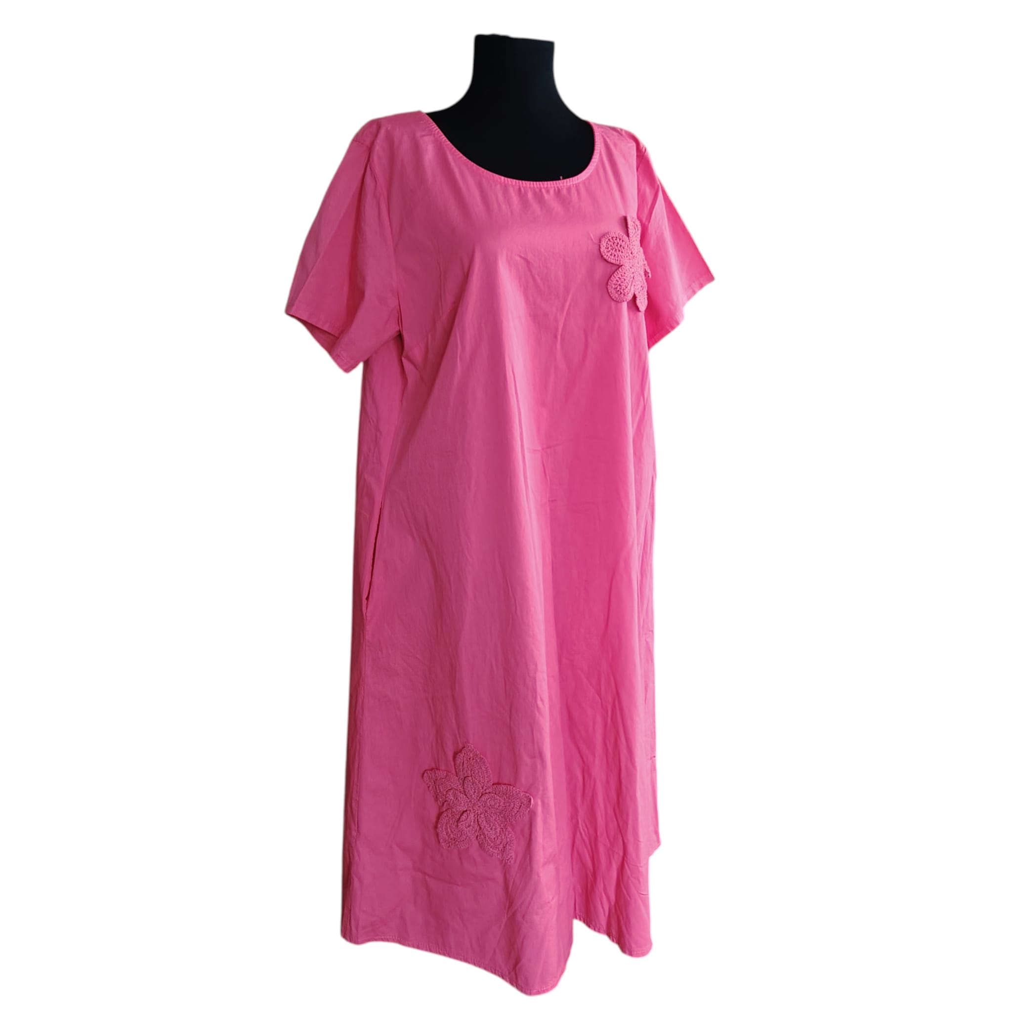 Descoperă echilibrul perfect între confort și feminitate! Această rochie midi, cu o croială lejeră și relaxată, este piesa pe care o vei alege ori de câte ori vrei să te simți bine și să arăți impecabil. Nuanța vibrantă de roz, mai precis o nuanță de roz bombon sau roz magenta deschis. O culoare calmă și relaxantă, foarte la modă, ideală pentru un stil minimalist și natural și detaliile florale texturate aduc un plus de farmec oricărei zile.