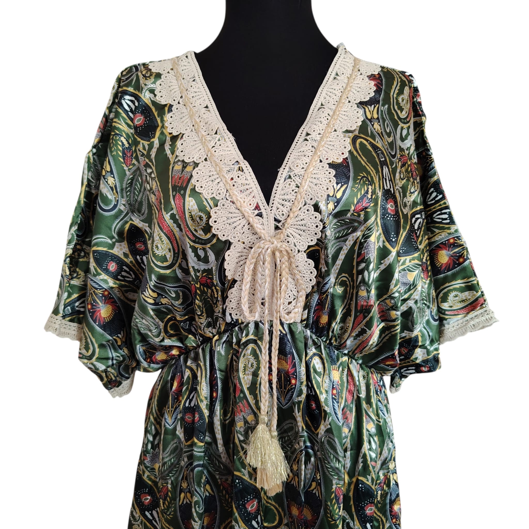 Îmbrățișează un stil rafinat și natural cu această rochie maxi în nuanțe de verde oliv și mușchi, decorată cu un imprimeu paisley sofisticat. Este piesa ideală pentru cele care caută un look boem, dar discret, fiind potrivită atât pentru evenimente în aer liber, cât și pentru o zi relaxată în oraș.