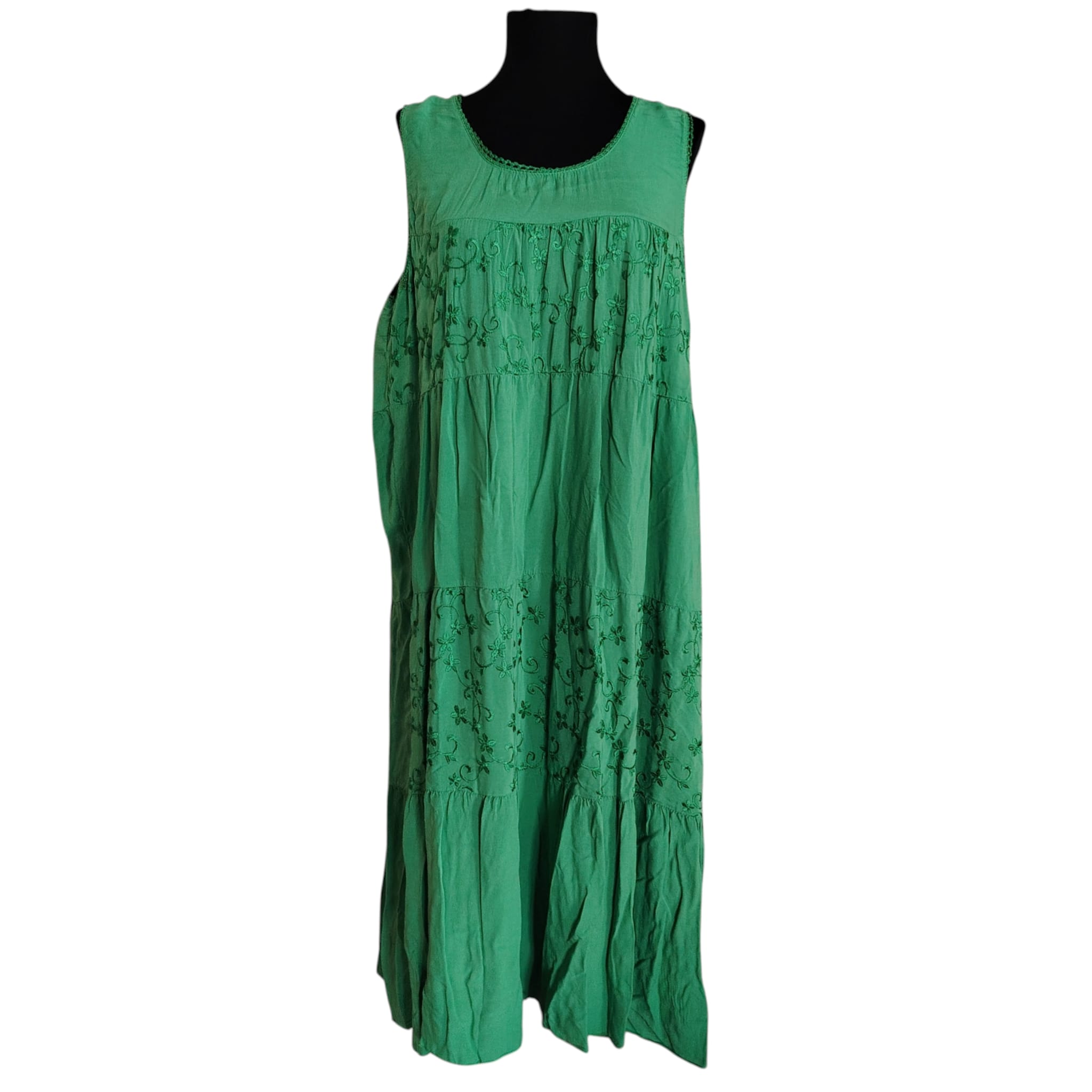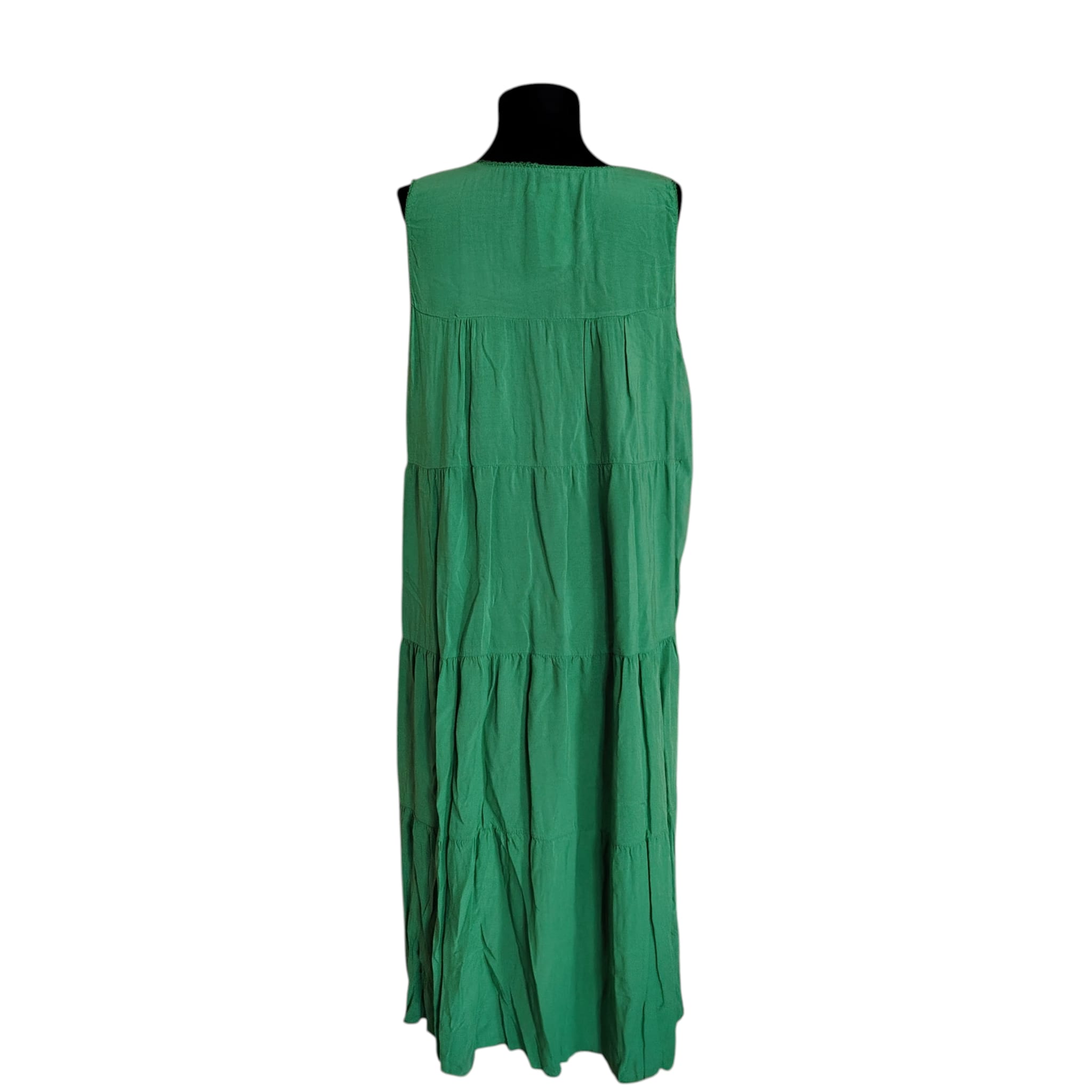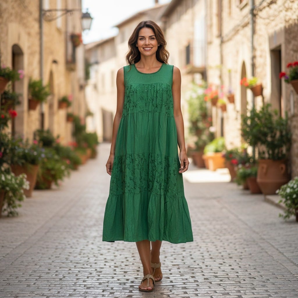Descoperă confortul absolut și eleganța relaxată cu această rochie maxi, realizată integral din viscoză fluidă. Culoarea verde profundă este pusă în valoare de straturile succesive și de broderia delicată tip „cutwork”, care adaugă o notă artizanală întregii ținute. Croiul lejer o face ideală pentru zilele calde de vară sau pentru evenimente informale în aer liber.