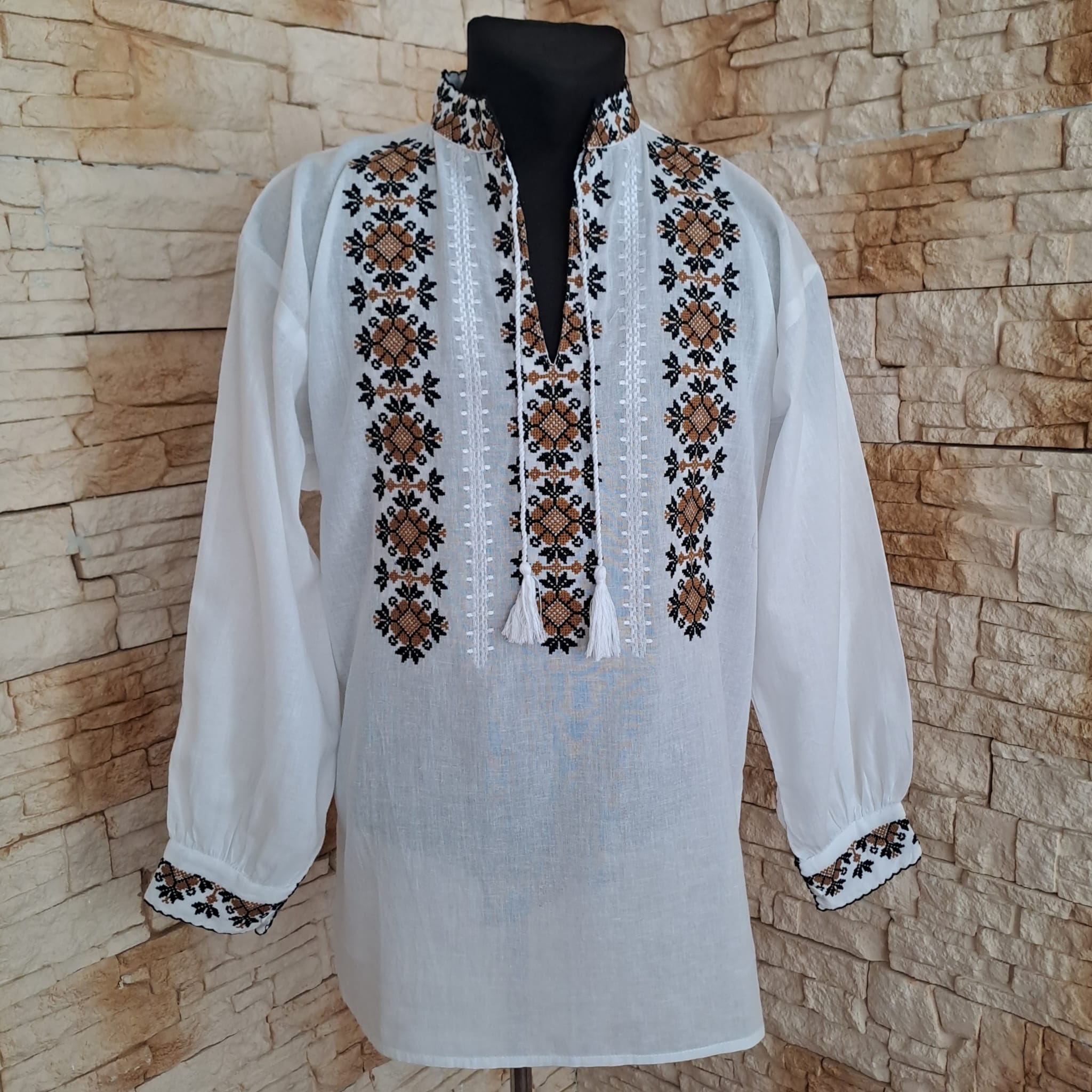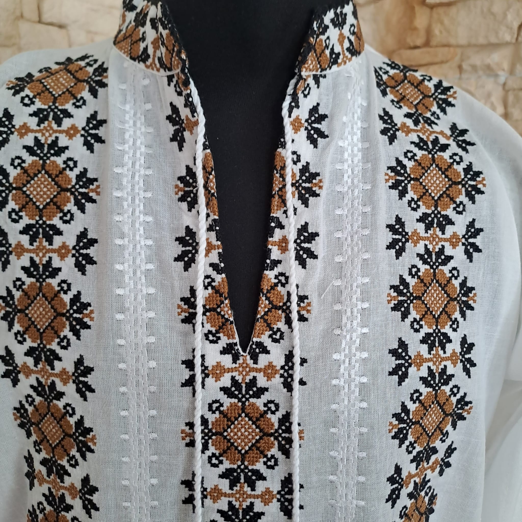 Camasa traditionala brodata , motiv geometric, ce se poate purta in multe zone ale tarii. Camasa este brodata pe guler si manseta [ se inchide cu nasture] . Culori folosite maro cu negru.