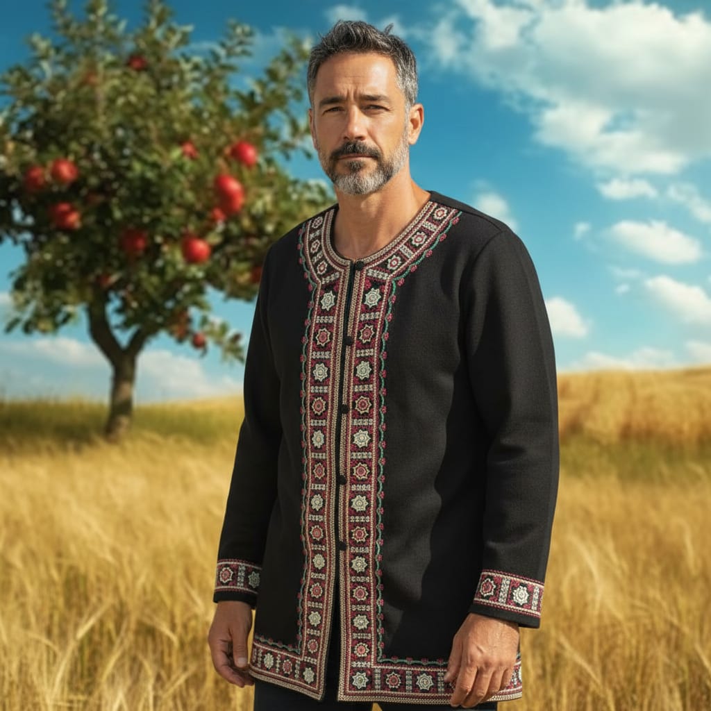 Sacou traditional brodat cu ata colorata, motiv geometric. Pentru ca are materialul foarte bun [ stofa din lana] , da o nota de eleganta . Poate fi purtat cu camasa traditionala la evenimente traditionale. Sacoul are captuseala .
