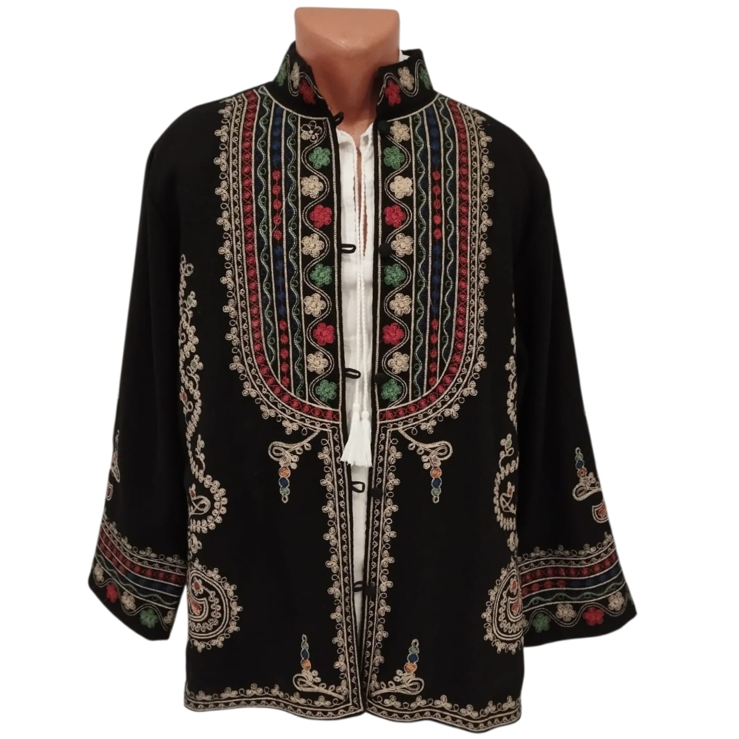 Sacou traditional brodat cu ata colorata, motiv geometric. Pentru ca are materialul foarte bun [ stofa din lana] , da o nota de eleganta . Poate fi purtat cu camasa traditionala la evenimente traditionale. Sacoul are captuseala .
