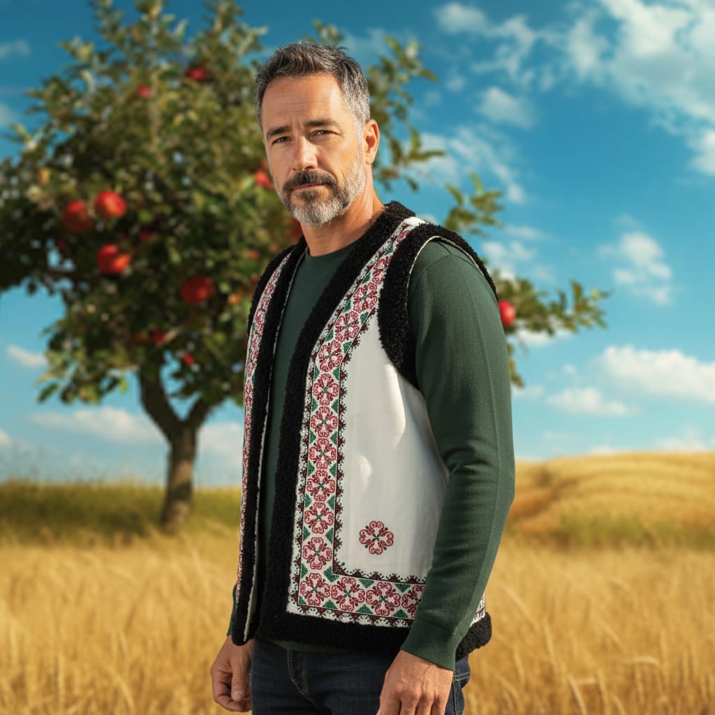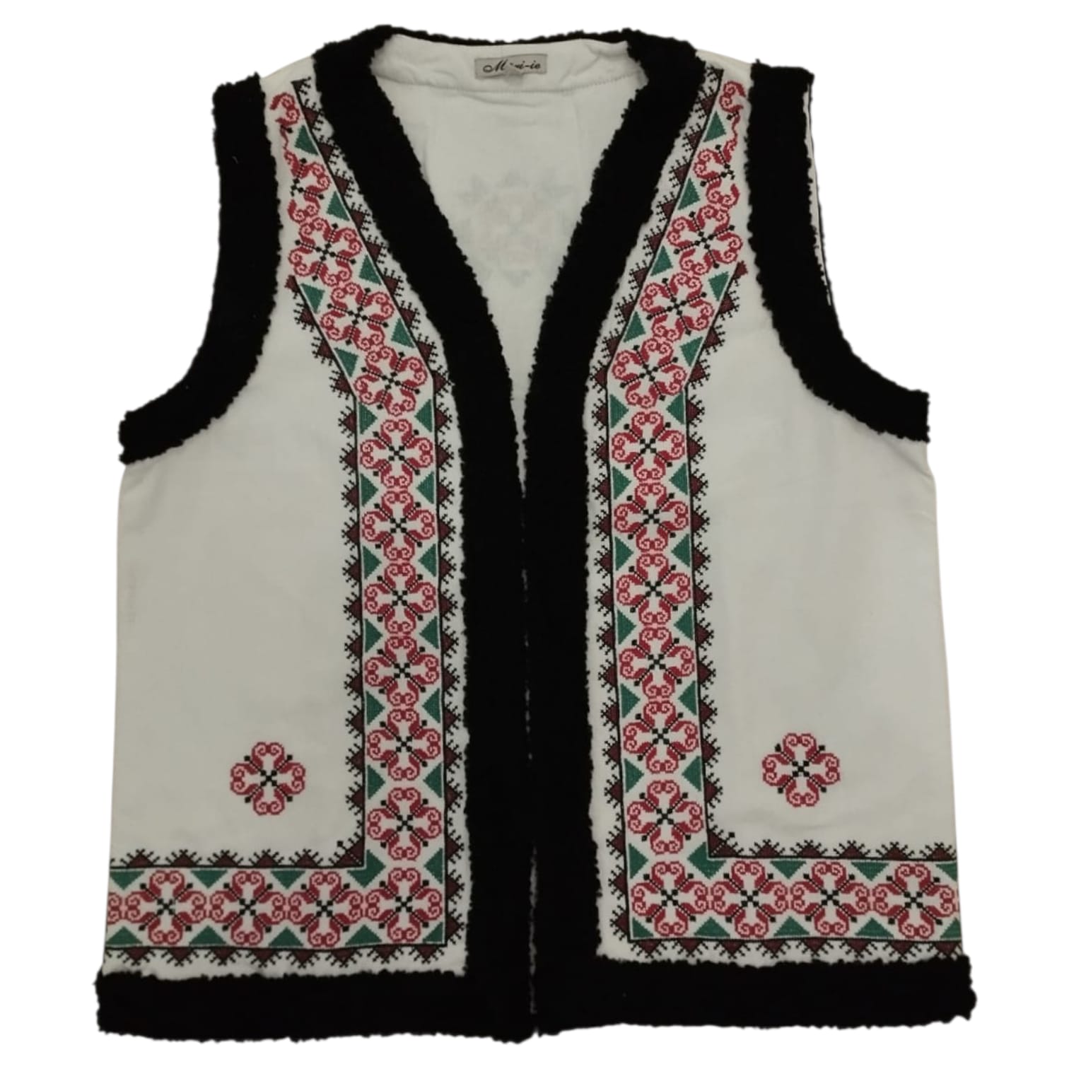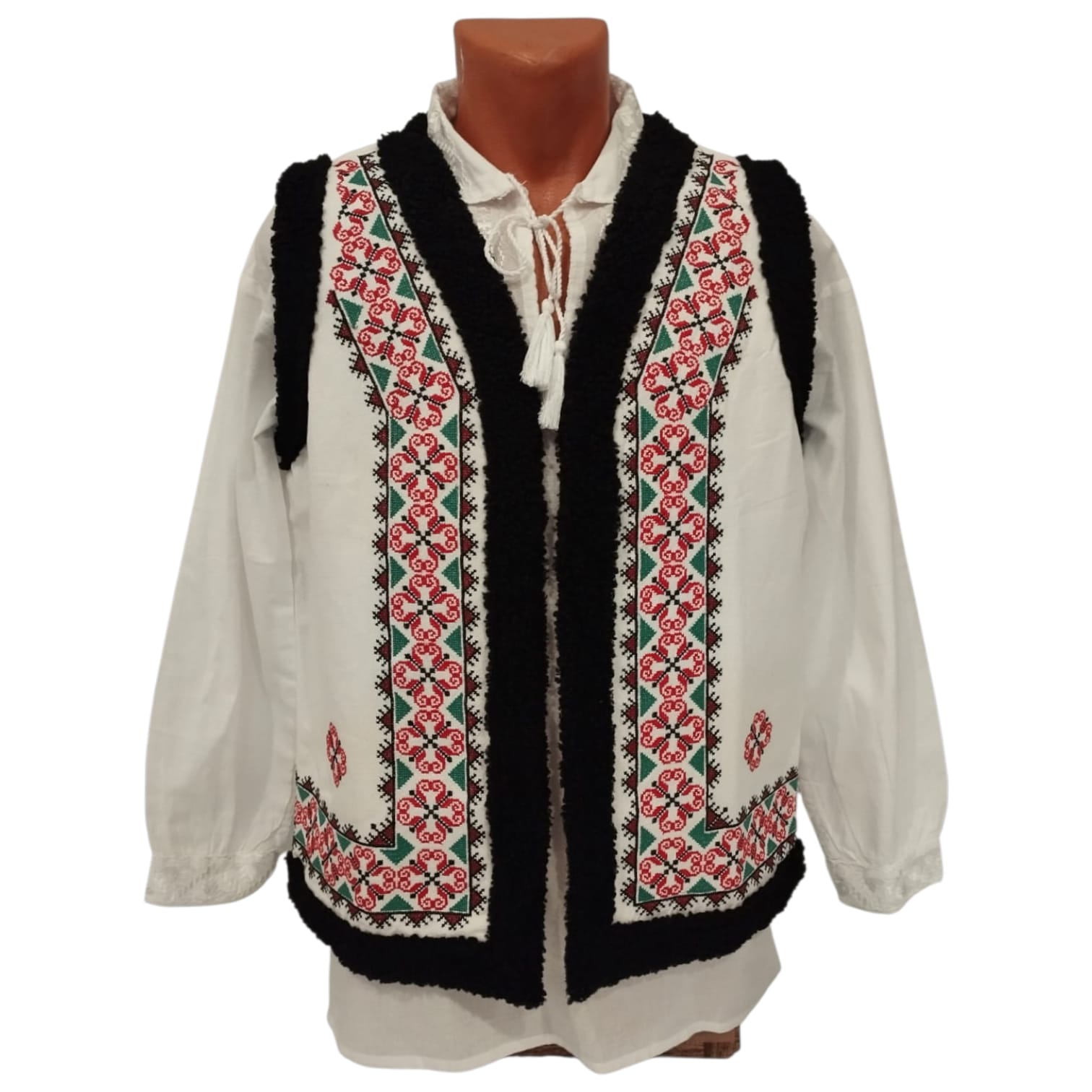 Vesta traditionala fond alb , brodata cu ata colorata, motiv geometric. Avand material bun, in topit, vesta se aseaza foarte bine pe corp.  Marginea vestei are treminatie cu blana. Se poarta cu camasa traditionala la evenimente culturale sau cu o camasa simpla , depinde de fiecare persoana. Vesta e captusita si are broderie la masina.