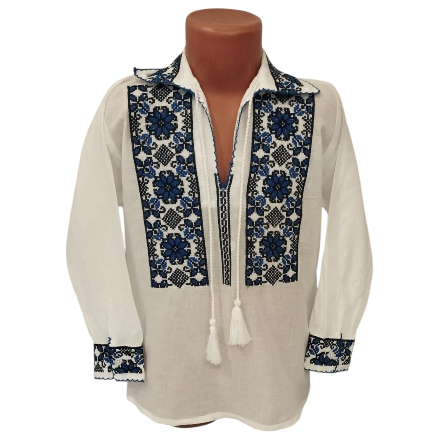 Camasa traditionala baiat brodata , motiv geometric cusuta cu ata albastra. Se poarta cu mandrie la evenimente cultuale si traditionale.